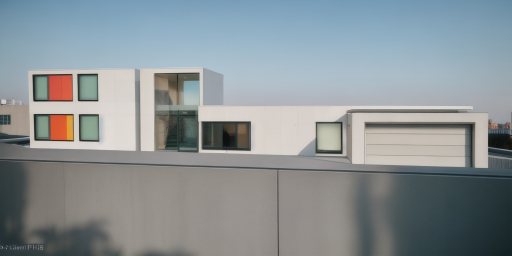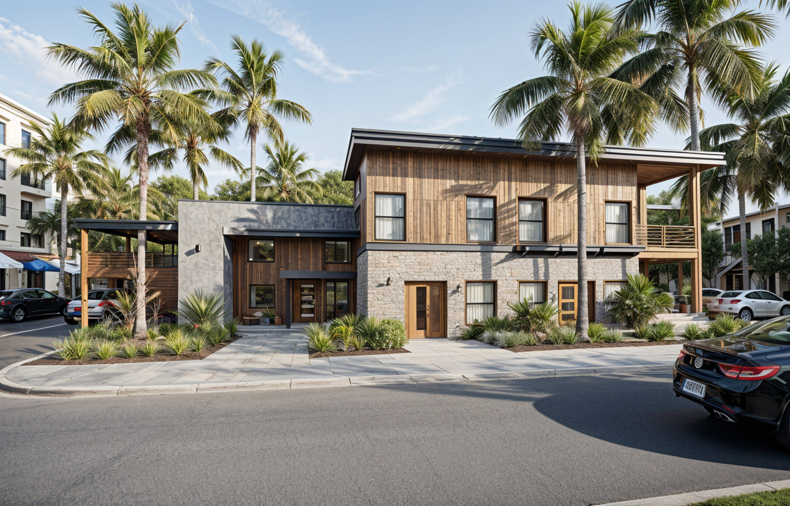 modern architecture exterior elevation white stucco dark blue metal roof black trim black window frames bright sunlight with green vegetation