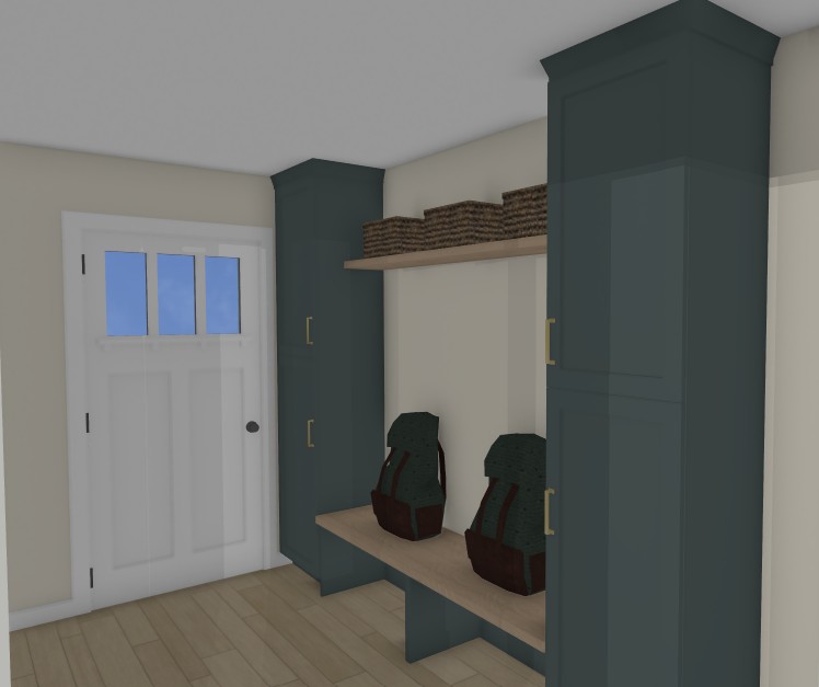 ultra photorealistic photograph of a modern residential mudroom custom built in cabinetry in deep muted teal with satin finish slim brushed brass pulls floor to ceiling storage units framing an open bench alcove three woven wicker storage baskets neatly arranged on the shelf two canvas backpacks resting on the bench with realistic fabric texture stitching and natural sag soft neutral wall color clean white trim light wood flooring minimalist scandinavian inspired design even natural daylight from a nearby window soft shadows realistic reflections accurate scale and proportions