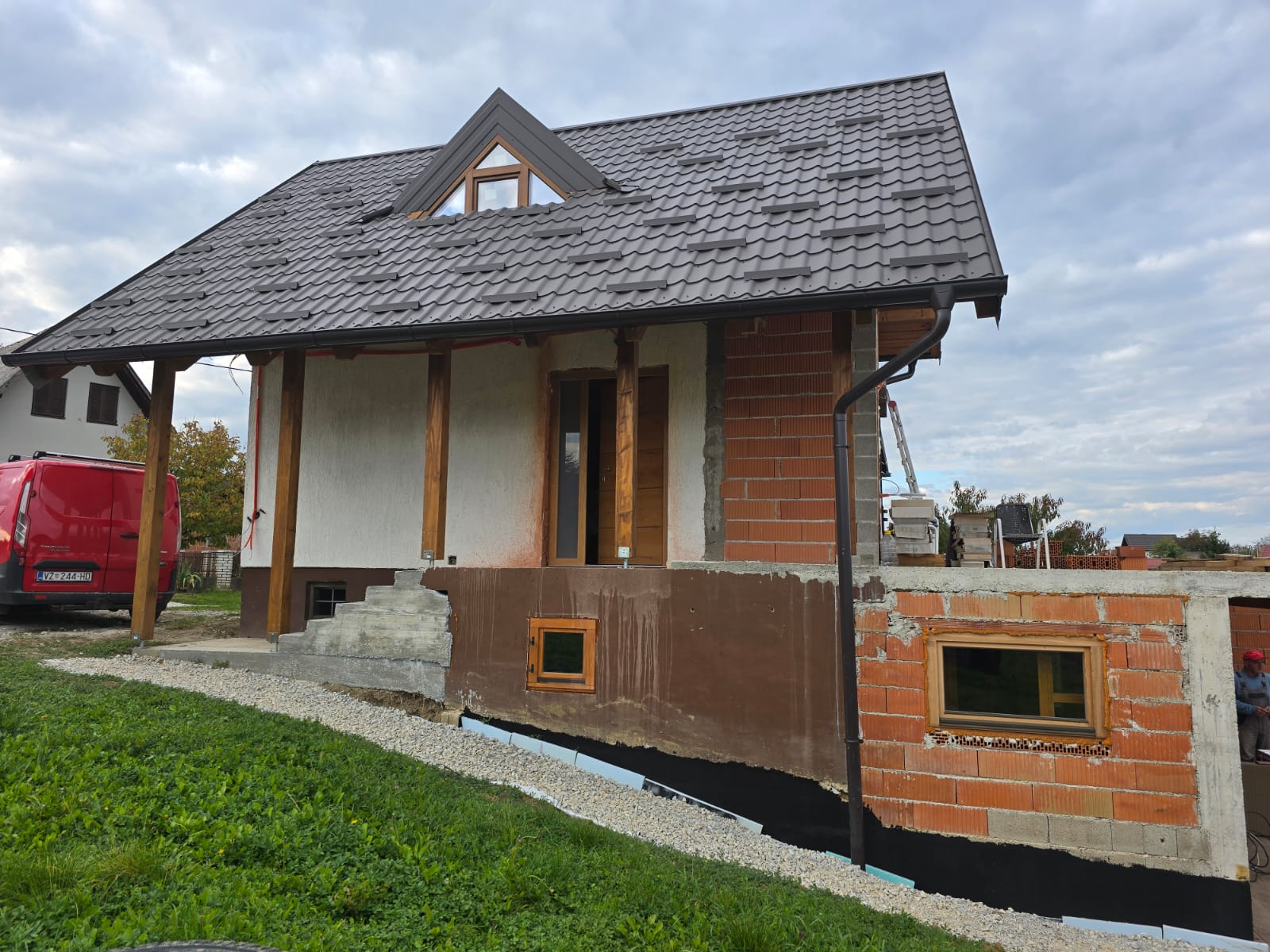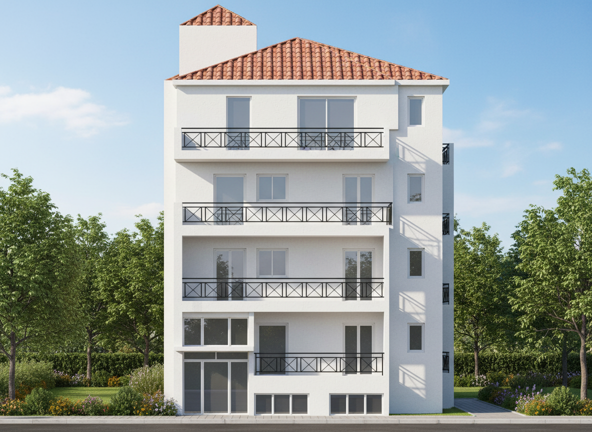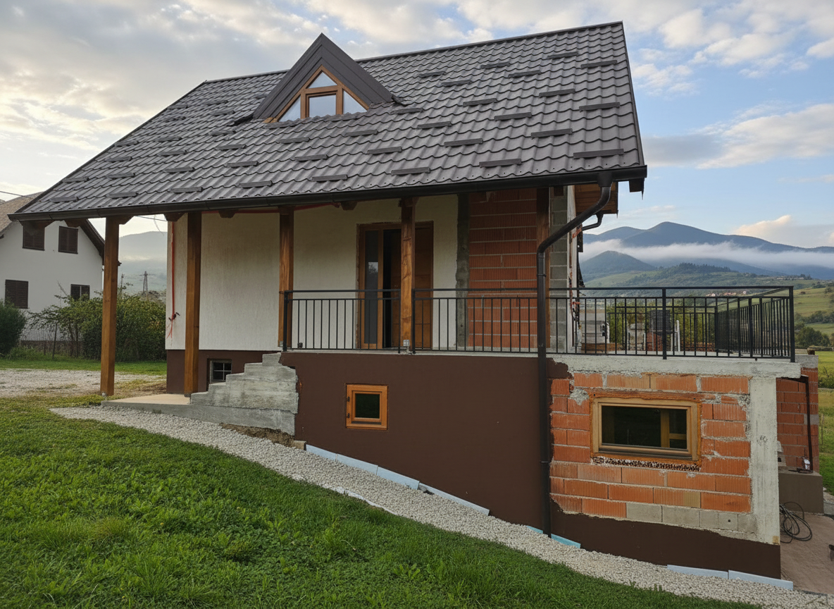 the upper part of the house where is door in beige facade the lower part in brown facades add a black railing with vertical bars on the stairs and in the extension of the terrace