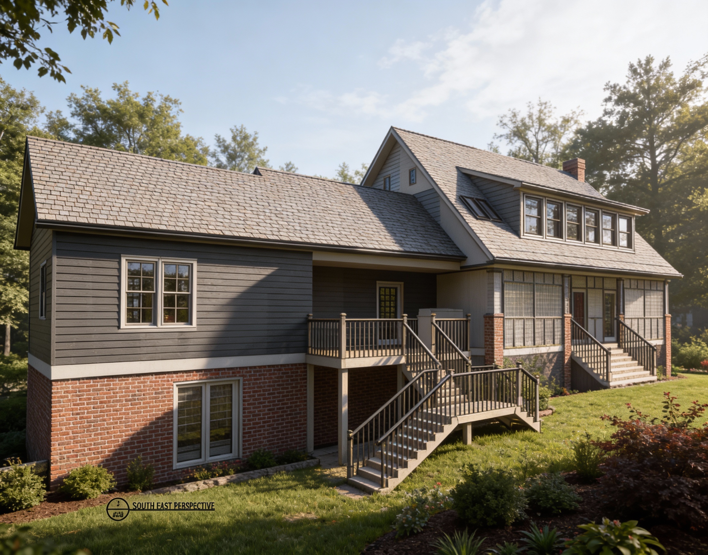black roof natural cedar porch columns off white stone black doors white windows off white siding