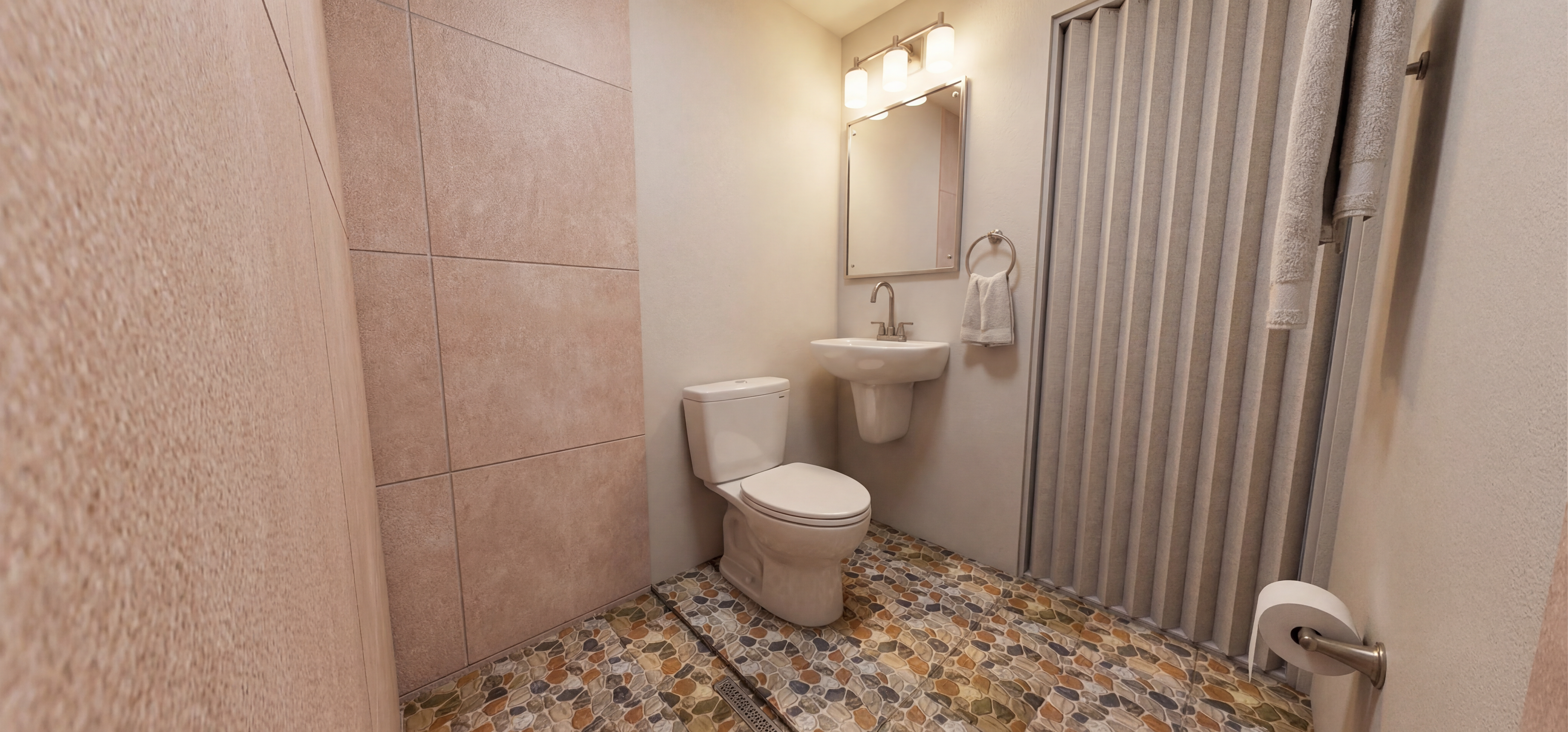 a high end architectural digest style interior photograph of a luxury powder room with a quiet restrained quiet luxury aesthetic the composition is shot like a professional architectural editorial photograph using a 24 35mm lens at eye level slightly offset framing for depth and realism the focal point is a floating vanity clad in green oasis marble with dramatic emerald and white veining bookmatched and highly polished the vanity feels heavy yet visually floating due to concealed wall mounting and subtle shadow gap lighting underneath above the vanity is a tall borderless vertical mirror with crisp polished edges mounted flush to the wall with no visible hardware the mirror reflects soft dim ambient light rather than bright direct reflections to the left wall a feature surface of arto timeworn 1x4 mesh tiles in bianco antico installed in perfect vertical straight set alignment the tile surface is matte slightly imperfect and softly textured mounted on the tile wall is a stephane parmentier ida wall sconce in aged bronze casting warm directional low intensity light with visible falloff and soft shadow gradients on the right side a sculptural modern column faucet in aged bronze descends elegantly from the ceiling aligned precisely over the sink basin with a minimal architectural presence a single knurled bronze control knob is wall mounted near the sink understated and minimal integrated into the composition rather than emphasized the surrounding walls are finished in portola paints roman clay in brooks creamy white plaster with subtle trowel movement soft irregular texture and natural variation that catches light unevenly the flooring is wide plank natural white oak with matte oil finish subtle grain variation and soft reflections only from ambient light lighting is the key focus cinematic moody and realistic a single warm key light from the sconce with low fill lighting from hidden architectural sources deep shadows gentle contrast and natural light falloff no overexposure no flat lighting no uniform brightness subtle vignetting and depth based falloff ultra realistic v ray corona renderer quality physical based rendering global illumination ray traced reflections no cgi flatness no perfect symmetry slight imperfections in materials for realism 8k architectural photography realism editorial luxury interior styling architectural digest cover quality add lighting change door color to lighter wood