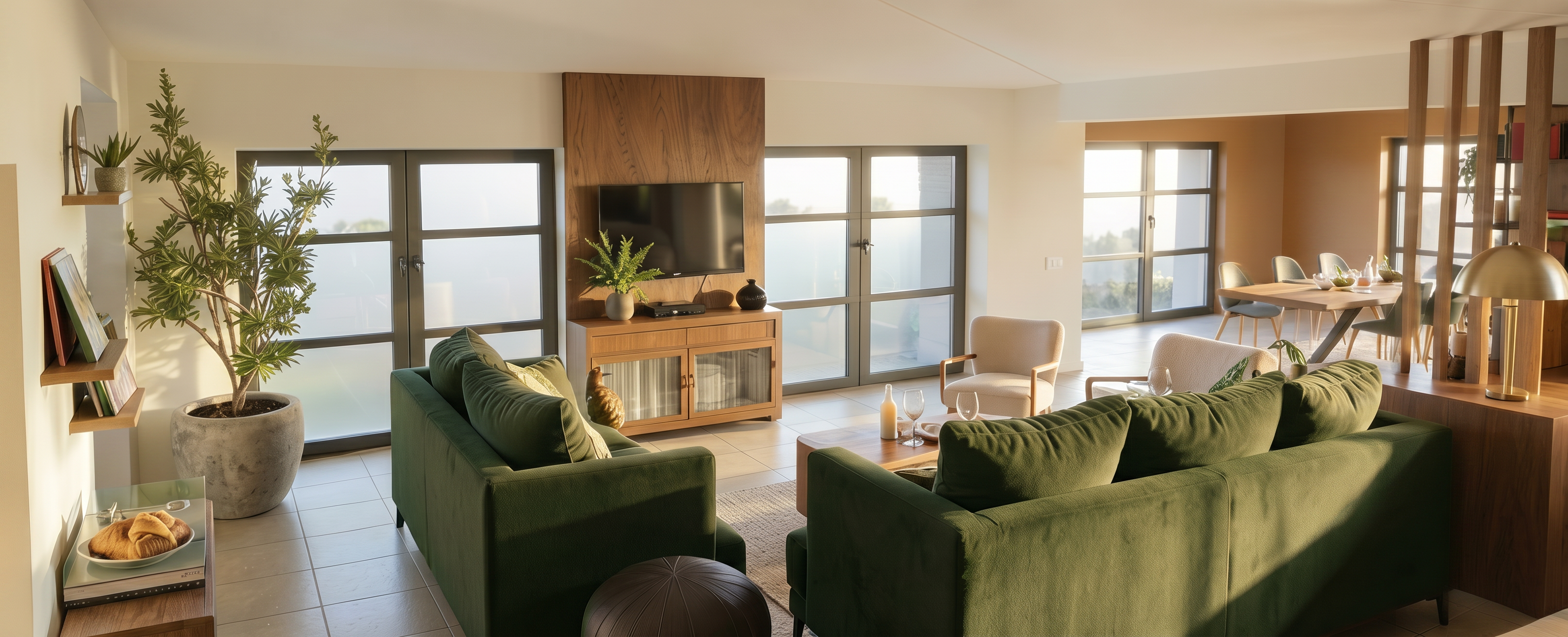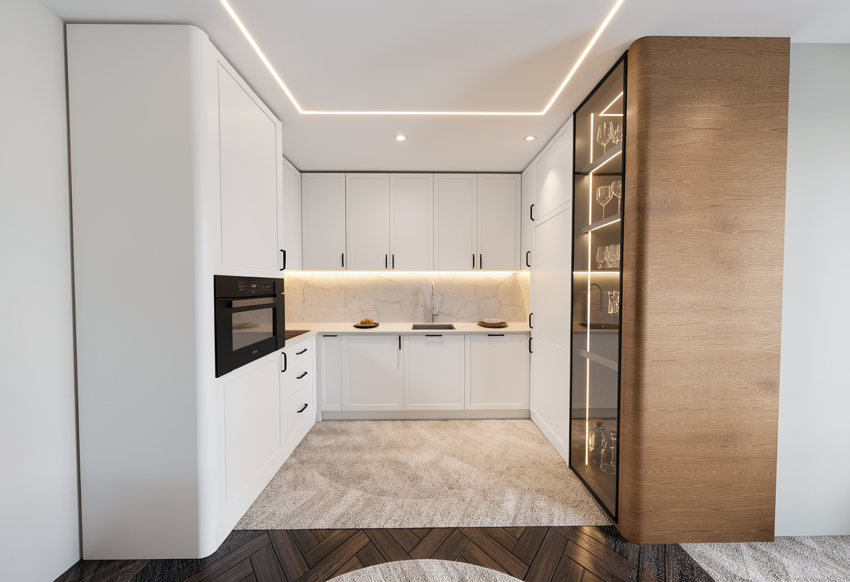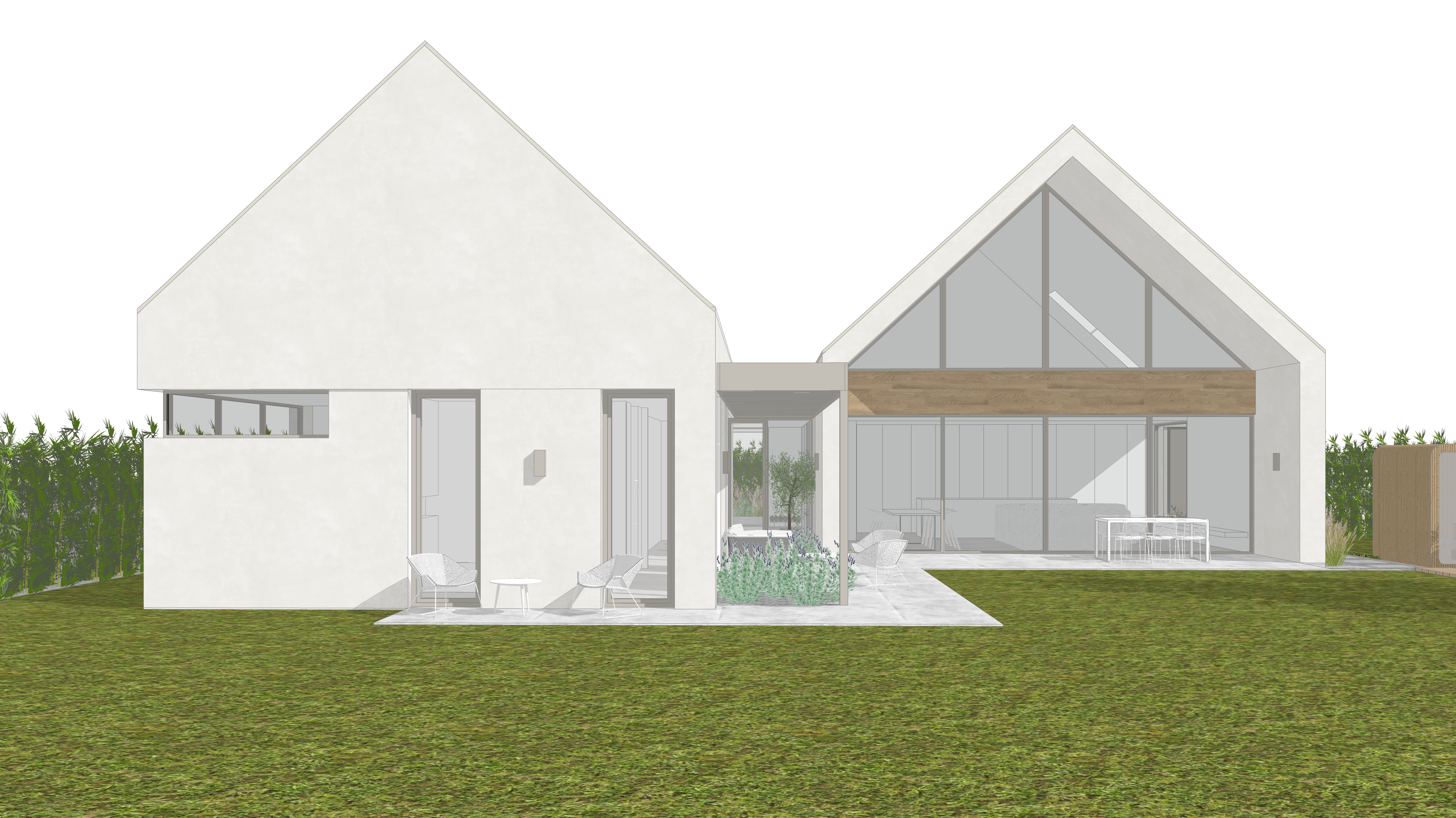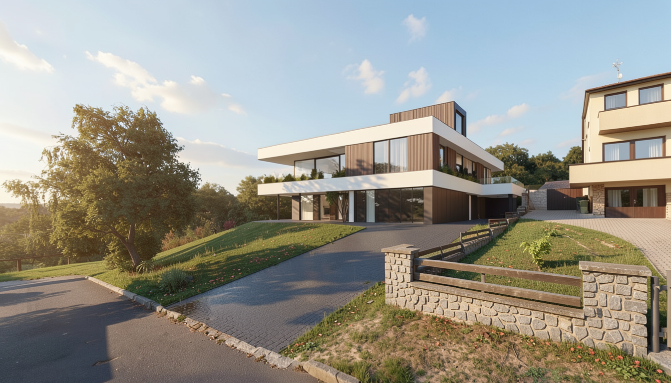 modern architecture light greige structurated rough concrete plaster facade evening matte coated titanium zinc roof in light greige natural oak main doors matte coated steel fence in light greige light grey beige aluminium windows photorealistic architectural visualization