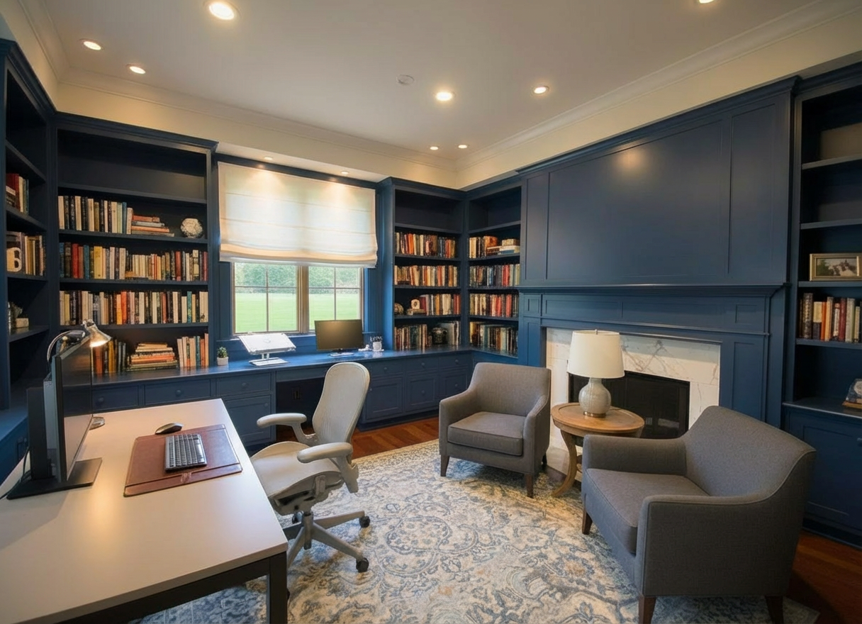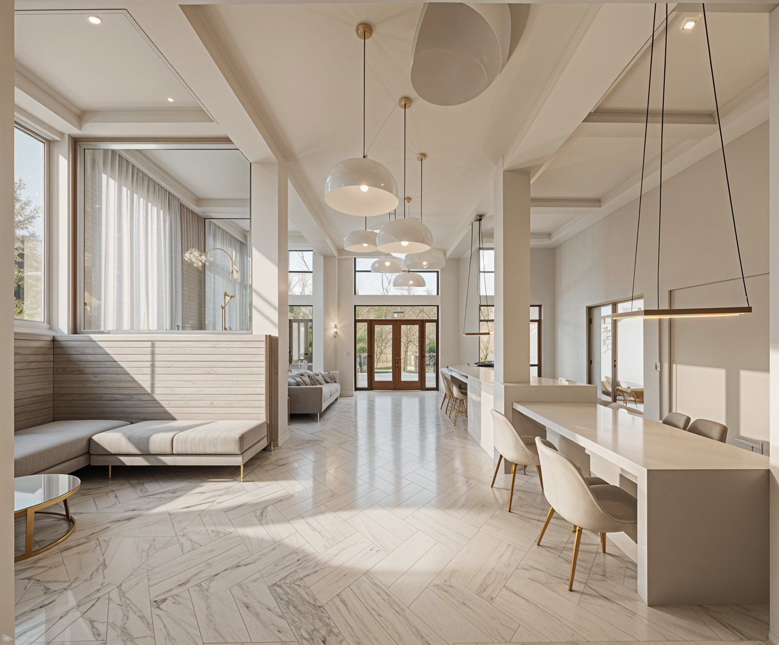 create a photorealistic rendering of this kitchen while preserving all existing materials colors and layout exactly as shown do not alter reinterpret or shift any finishes the hood is a brushed copper metal with a soft natural patina maintain its exact tone and shape the island is a medium caramel wood tone with visible grain keep the warmth and depth consistent all perimeter cabinets are a deep black stained wood with visible wood grain the grain must clearly show through not painted not flat black maintain the contrast between the dark perimeter cabinets and the warm toned island doorways important both side doorways should lead into small adjacent rooms not blank or exterior space these rooms should feel cohesive with the kitchen by using coordinating warm earthy tones no bright white or stark contrast pull colors from the kitchen palette warm wood tones soft browns muted neutrals so the transition feels natural and intentional keep lighting in these rooms soft and warm slightly dimmer than the kitchen for depth lighting all sconces must have visible downward facing light downlighting casting a warm glow onto the backsplash lighting should be warm and realistic enhancing materials without washing out color additional instructions show all perimeter cabinetry clearly no loss in shadow or cropping keep backsplash flooring trim and architectural details exactly as shown maintain a high end real life rendering style not overly stylized or dramatic preserve hardware finishes and placement show all perimeter cabinets