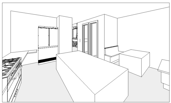 plenish this space lighter wood tone less grain white ceiling hide pergola on 2nd level white ceiling above dining table ceiling crown white too even lighter wood tone refer to this image paint all the wall white put sky outside of second floor windows same strategy apply to this image remove the bottom window infront of stairs plenish kitchen using same strategy add kitchen hood on top of range all upper cabinet at two side of hood tile below wall add upper cabinet at left hand side wall too add upper cabinet at left and right of the kitchen hood marble countertop isalnd with marble waterfall waterfall at short side waterfall at island width add table foot at far right end table go back to previous upper cabinet to ceiling same strategy for this kitchen incorrect kitchen range at left hand side use exactly the layout as attached drawing range at left hand side breakfast table at right hand side two doors behind dining table frig in the back wall