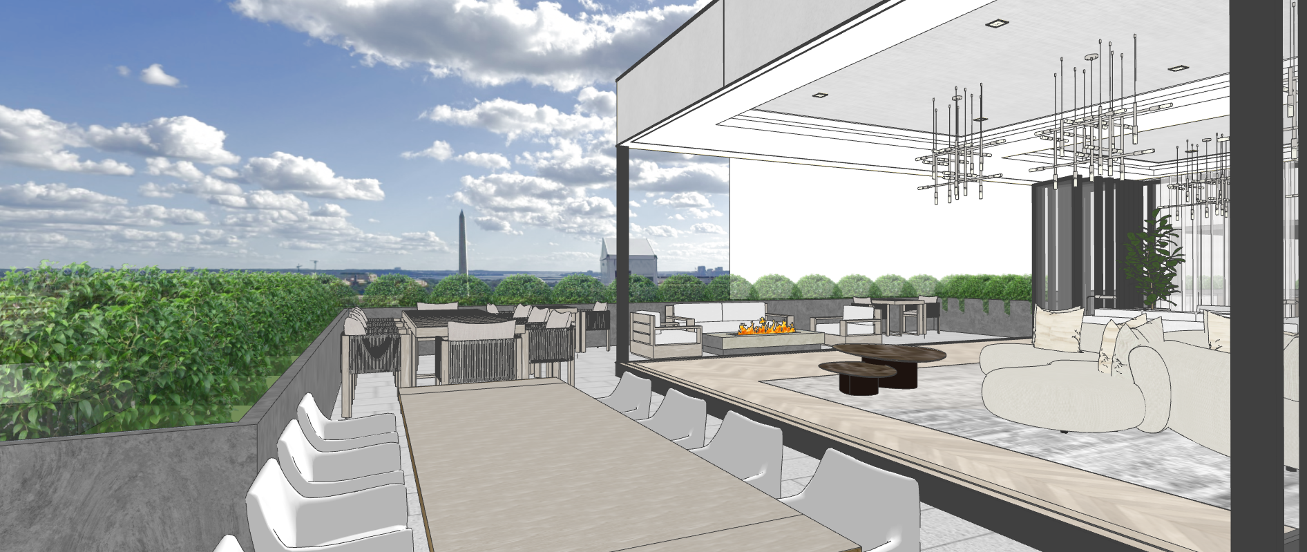 make realistic render of the luxurious high end penthouse overlooking the washington monument also business people enjoying the view and lounging around