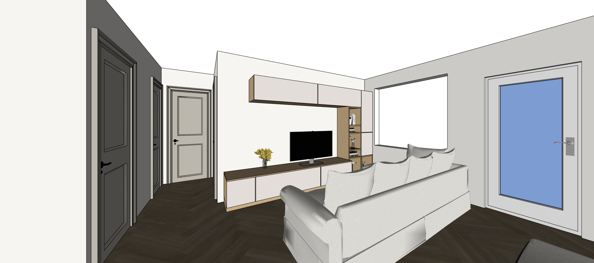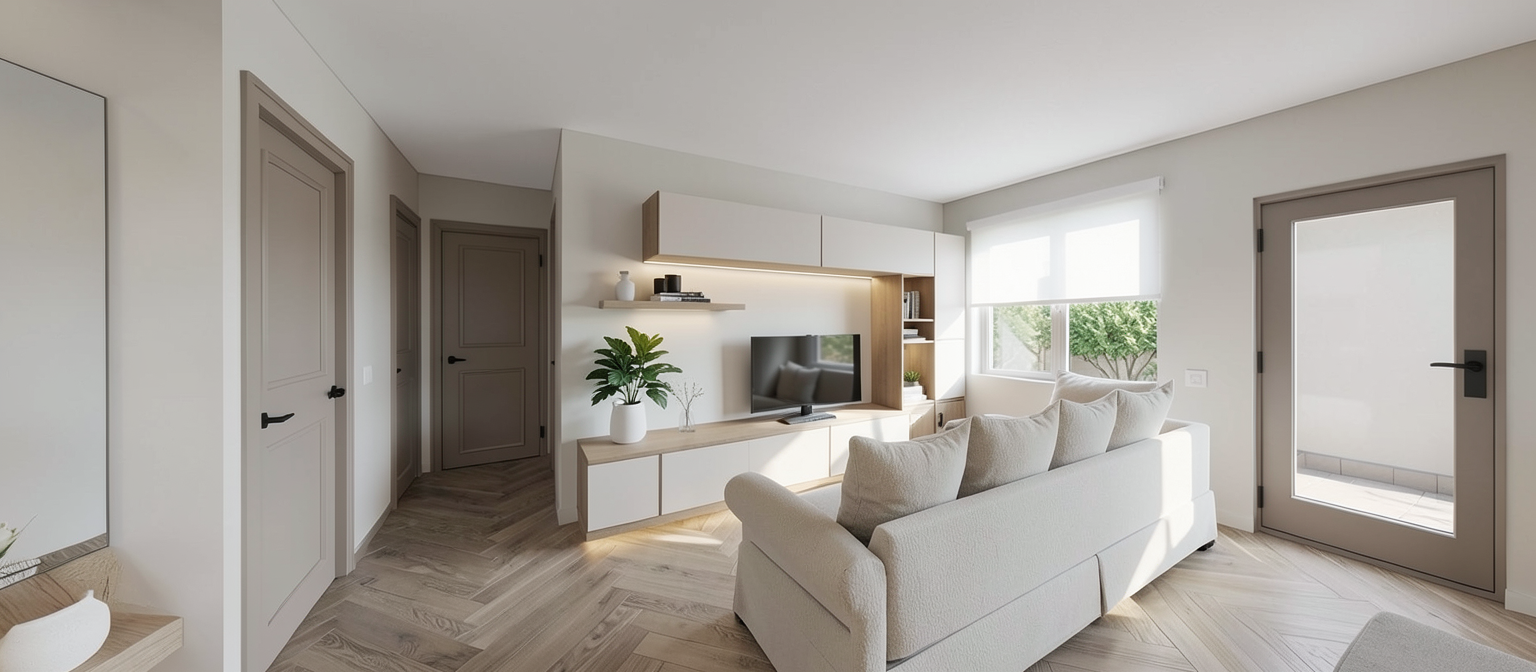 render a modern neutral living room interior with sleek minimalist design maintain all the design and finishes applied in this model use a palette of light oak for the cabinets and shelves balanced with off white off white for cabinet doors the floor is a rich herringbone neutral light wood adding depth and warmth the walls are a soft neutral white to enhance the spacious feel the atmosphere is bright and airy with natural light streaming through a large window and patio door room doors are neutral taupe with black hardware add white vase and green plant on the tv unit decorate shelves add under cabinet lighting add white light filtering blind there are no ceiling lights bring ample natural lights through window
