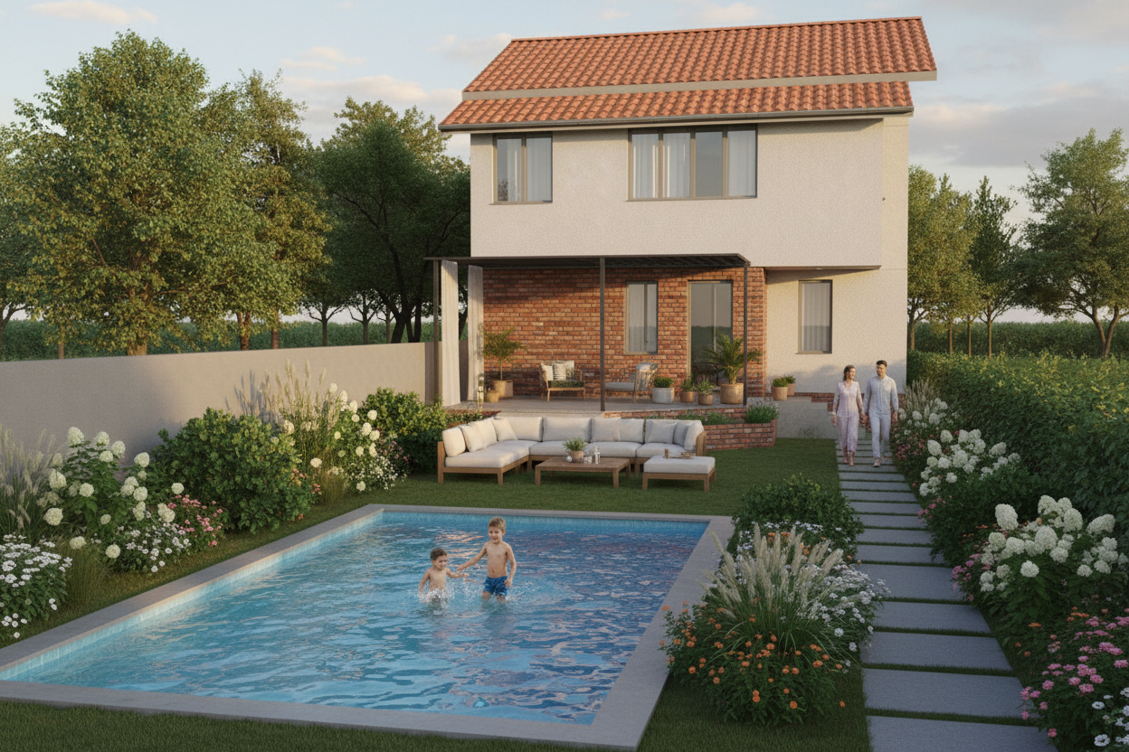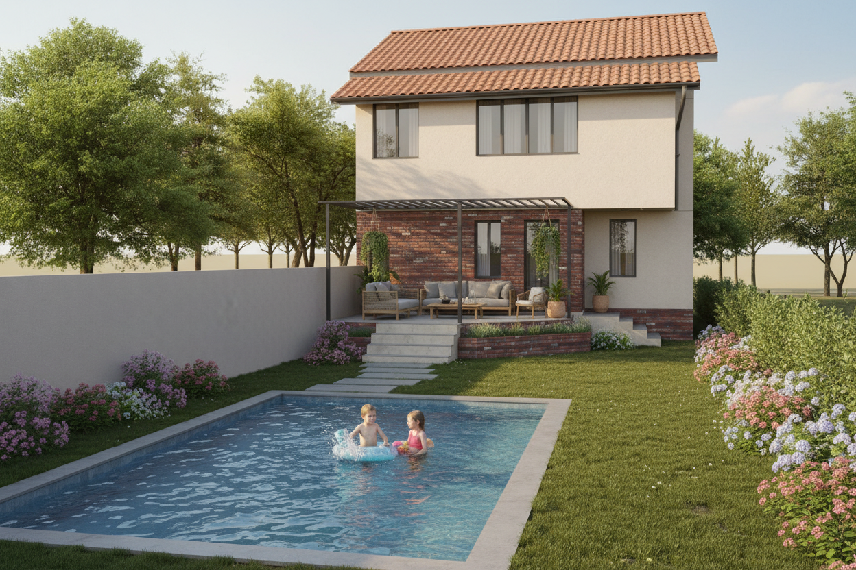 roof darker grey wavy the brick facade texture is important use the ref image terrace furniture modern cozy greenery around the house nice wather summer around 6pm breeze reference photo for the brick pool 2kids playing in it in the garden flowers but leave the black fence to see the neighborhood