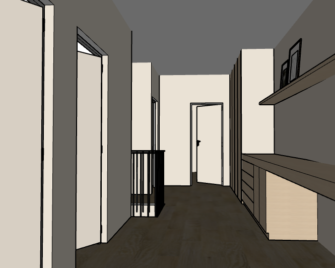 image edit only prompt archsynth use the uploaded image as a fixed base image this is an image color edit only not a redesign allowed changes only these change the wall color to a warm beige tone change the doors door frames and baseboards to exactly the same warm beige tone as the walls doors must be the same color as de walls no wood color must remain visible on doors frames or baseboards ceiling lighting limited exception add two recessed ceiling spotlights centered along the hallway ceiling axis the spots must emit a soft warm light spot size intensity and placement must be minimal and realistic do not add any other light sources forbidden changes critical do not change door material shape thickness or position do not change the stair opening or stair void do not add remove resize or reinterpret the staircase opening do not change the railings or their color do not change any wood elements other than recoloring the doors as specified do not change lighting mood shadows exposure or contrast beyond the two allowed ceiling spots do not change camera angle geometry or layout no new objects no material reinterpretation no aesthetic improvements if an element is not explicitly listed under allowed changes it must remain pixel identical to the original image