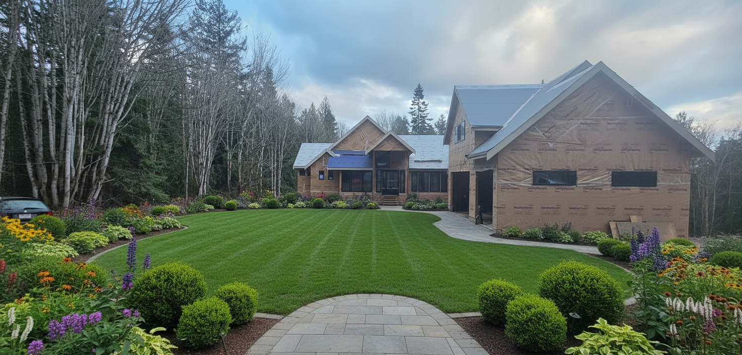 modern exterior shot hyper realistic exterior with natural lighting and clear modern interior with interior light lush landscape garden with realism trees architecture