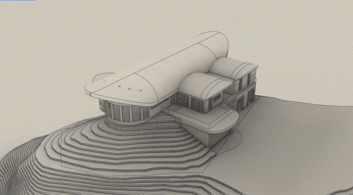 architectural watercolor rendering of the exact building geometry shown in mnt data screenshot 2025 11 18 155711 png do not alter or reinterpret any building geometry roof curves terraces columns decks or proportions depict the building correctly oriented so that the steep cliff is on the left side of the building dropping down into the forest valley and the right side shows natural ground level continuing into the landscape replace the blocky contour terrain with realistic rocky slopes and dense forest vegetation the left side must show the dramatic cliff while the right side transitions into solid ground grass soil and forest growth the main sweeping roof must be black corrugated metal with clear ribbing the smaller curved roof pieces must also be solid black metal all walls must be matte gray metal panels and windows must be black steel framed preserve the background from the previous rendering distant hazy mountains cloudy bright blue sky and soft atmospheric fog in the lower valleys render in soft architectural watercolor style with pencil ink linework natural washes and gentle paper edge fading while maintaining full geometric accuracy
