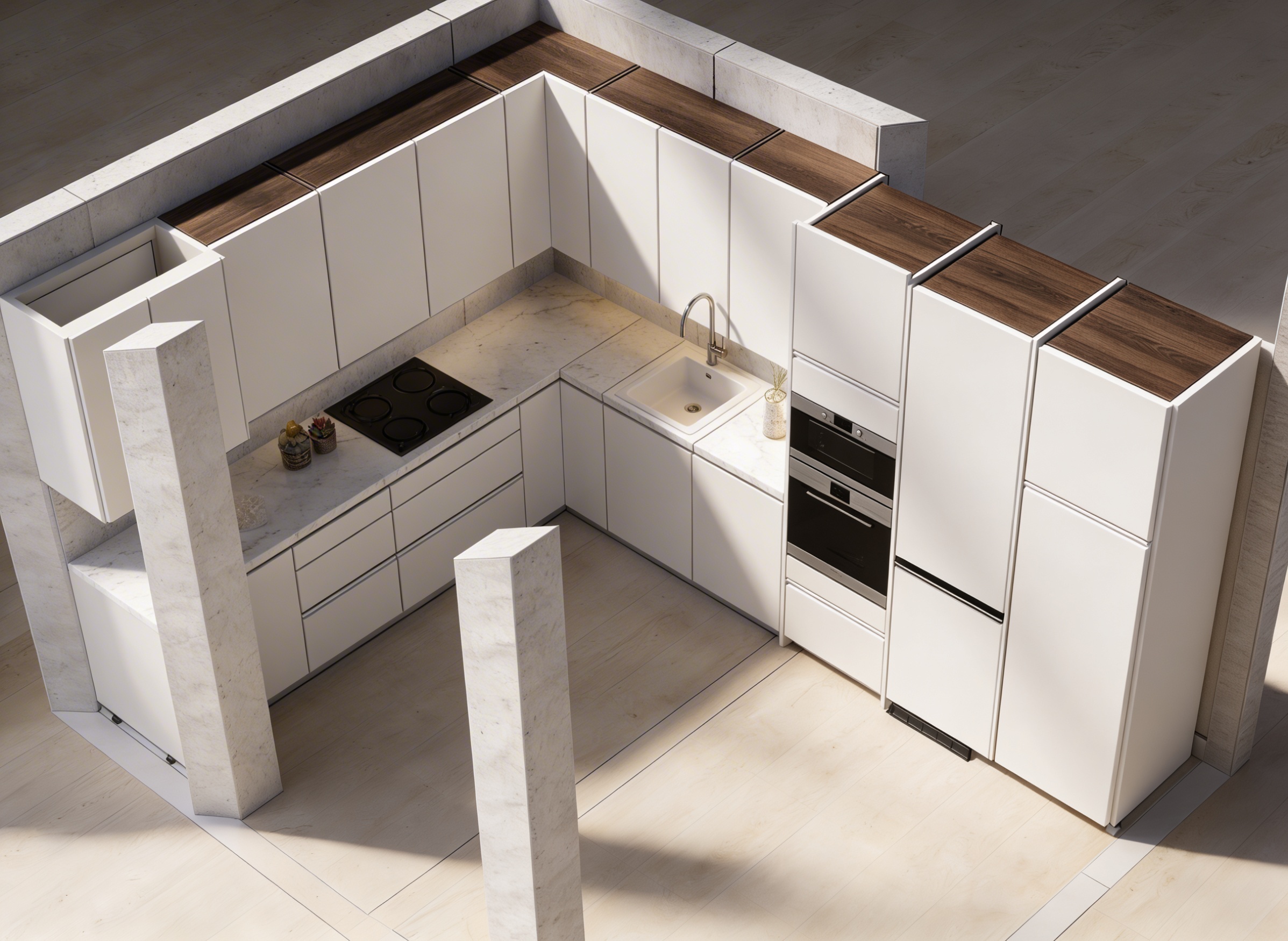 utiliza luz natural dia luminoso para la escena encimeras porcelanico calacatta cambiarlas quitar las ventanas tono de las puertas mas calido
