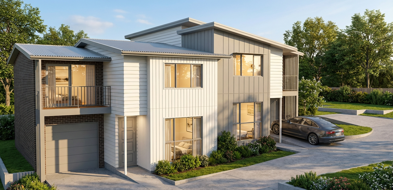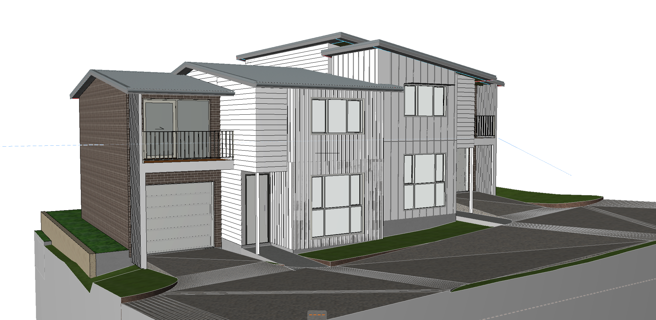 transform this archicad image into a high resolution render include landscaping a car and trees in the background