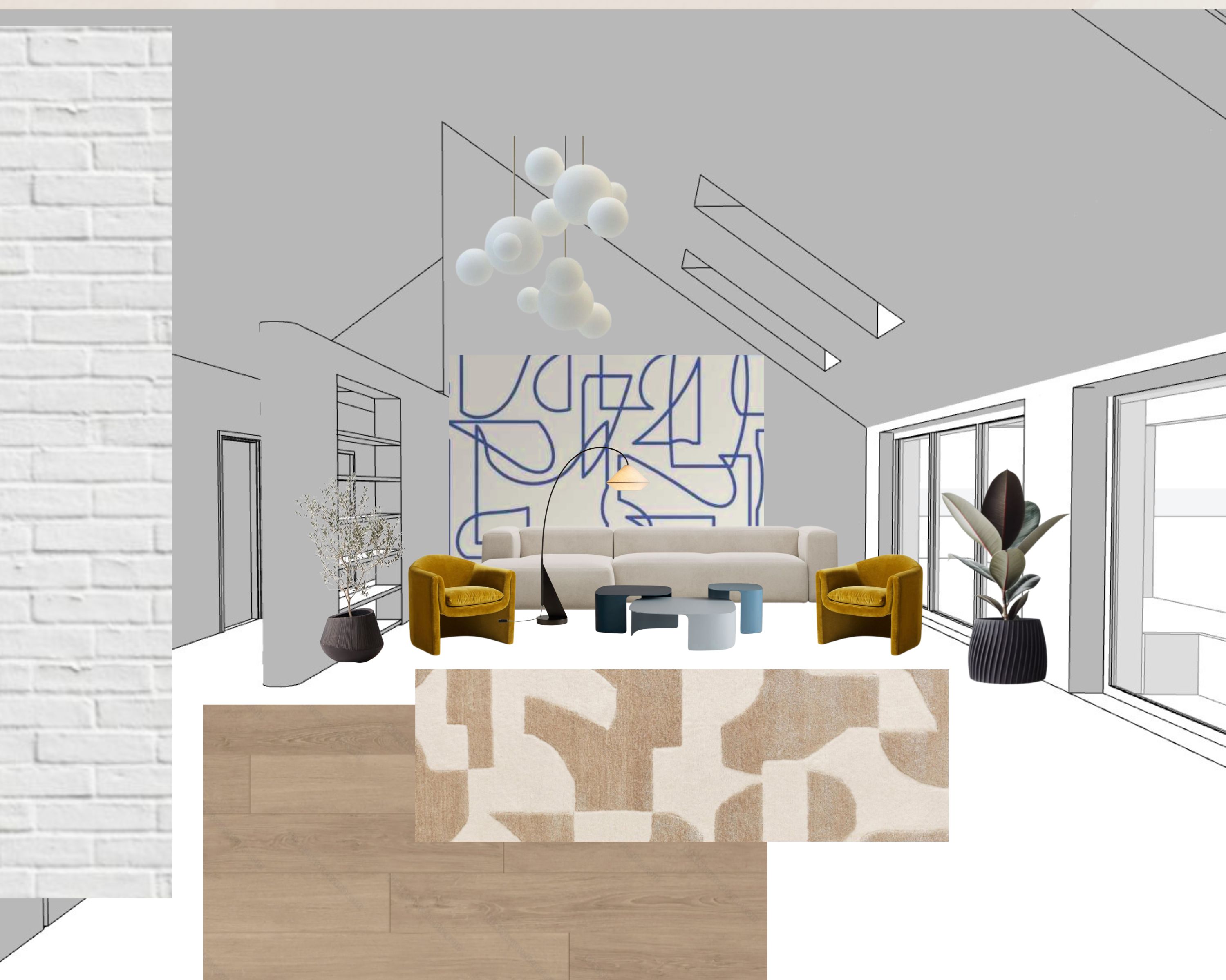 create barn livingroom interior using moodboard furniture colors and materials everything in natural size and spacing to look good