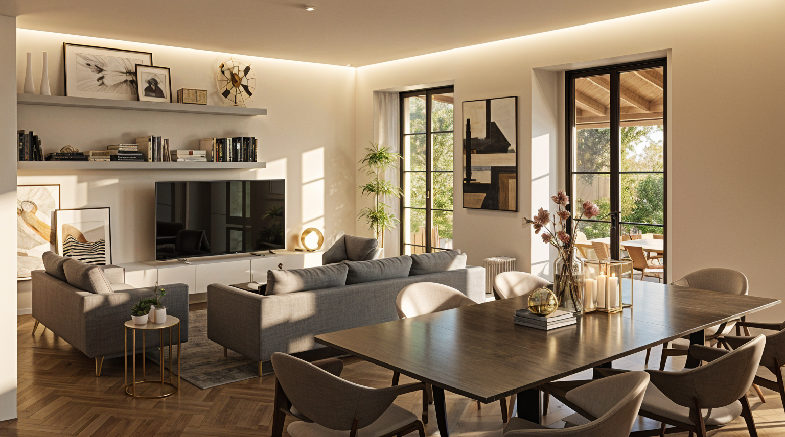 transforms the provided restaurant interior image into a high end photorealistic rendering with warm golden hour atmosphere soft bright highlights keeping everything exactly the same same proportions same wall finishes same materials and same spatial configuration do not move or alter objects geometries textures colors or furniture positions lighting should emphasize the warmth of the golden hour delicate reflections soft shadows and a greater richness of color enhance depth and realism through rich detail keeping the entire scene exactly as originally designed outside the window there s a veranda whose canopy you can see which must be made of wood keeping the beams and canopy unchanged in the background beyond the veranda you can see a garden the veranda is separated from the garden by a glass window and side walls behind the window on the left is a wall with a window insert led lighting between the ceiling and the walls only the light should be visible not the lighting body the walls should be made of smooth white plaster the image must not change same position of furnishings same perspective strsso point of view same materials