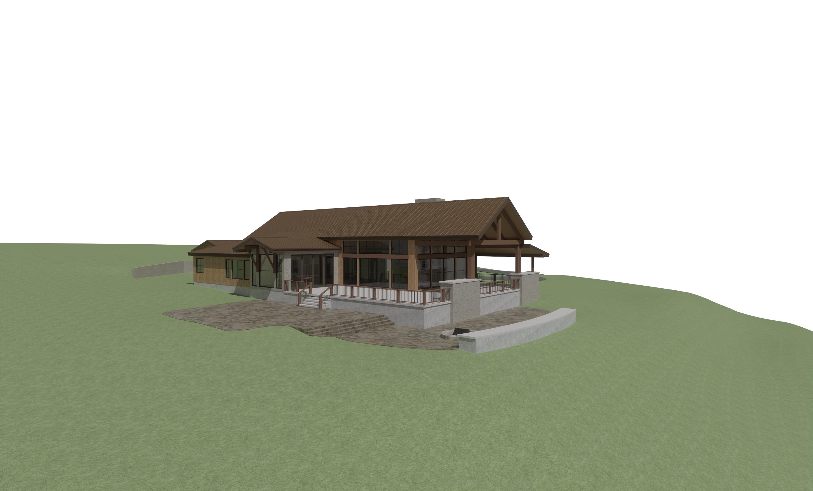 this in montana use native montana trees and vegetation make wood siding ghost wood like jackson hole but leave the rock siding dont change the rock siding just make it more realistic there is rock on the smaller gable to the left make golden hour outside show golden light coming from inside make roof copper standing seam roof make rock on concrete on foundation do not change the shape of the structur or window sizes there is rock slab patio on left side of porch keep rock on walls no trees to the left make small mountain far off in distance to the right create a realistic elevation of the architectural design maintaining the original materials of lap siding in their correct locations enhance the lighting and shadows for a lifelike effect but ensure that the texture and arrangement of both siding types remain exactly as in the original design make sure to keep the rock on the walls the same the background is and open field with montana trees far off in distance the hill slope up slightly to the right and drops off dramatically to the left add rock to foundation walls add firepit to patio add trees far off in distance patio should wrap around to front of deck add rock material to concrete foundation walls no concrete show rock