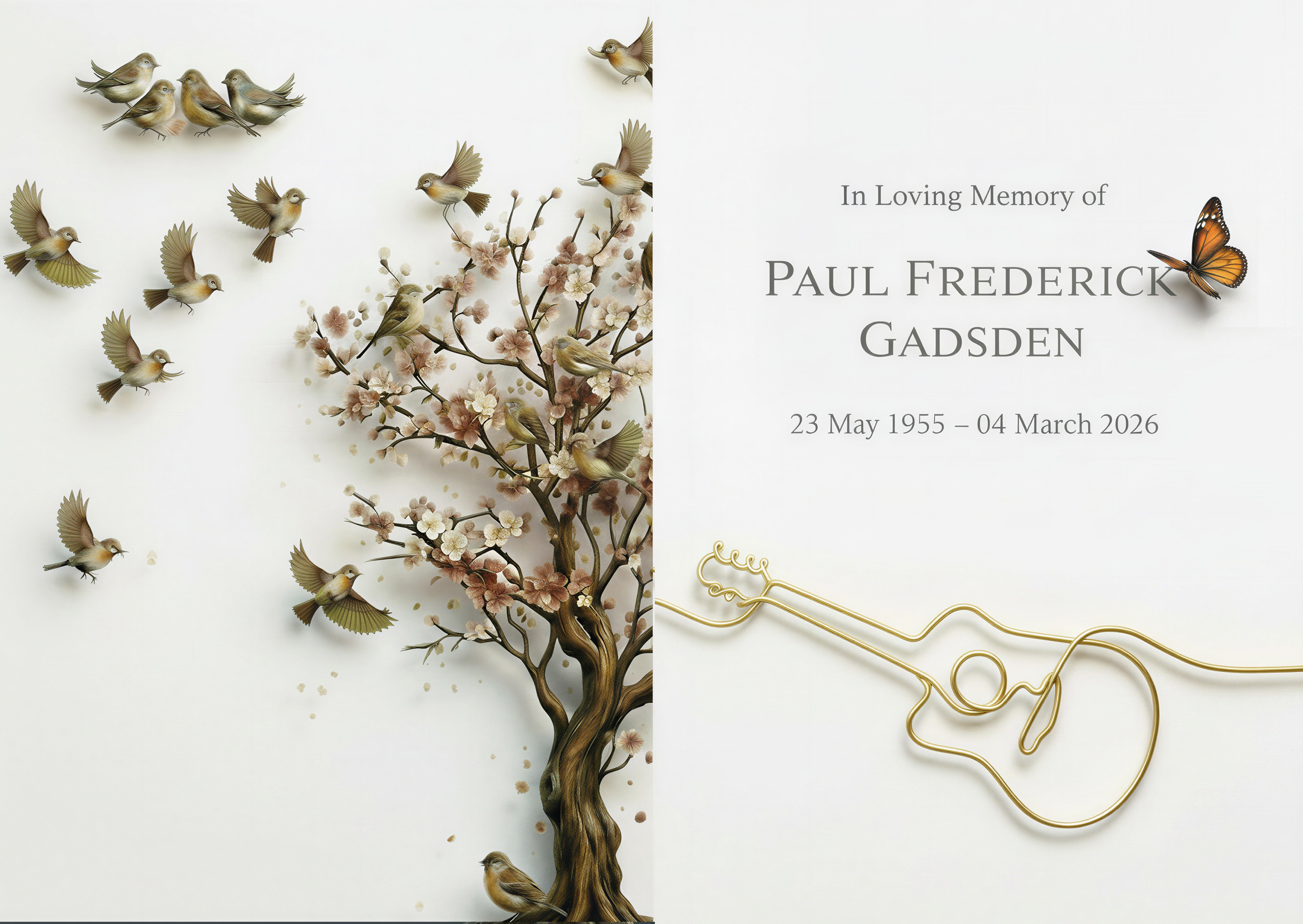 keep this image identical but make the background pure white not off white keep the shadows to the guitar butterfly birds and tree
