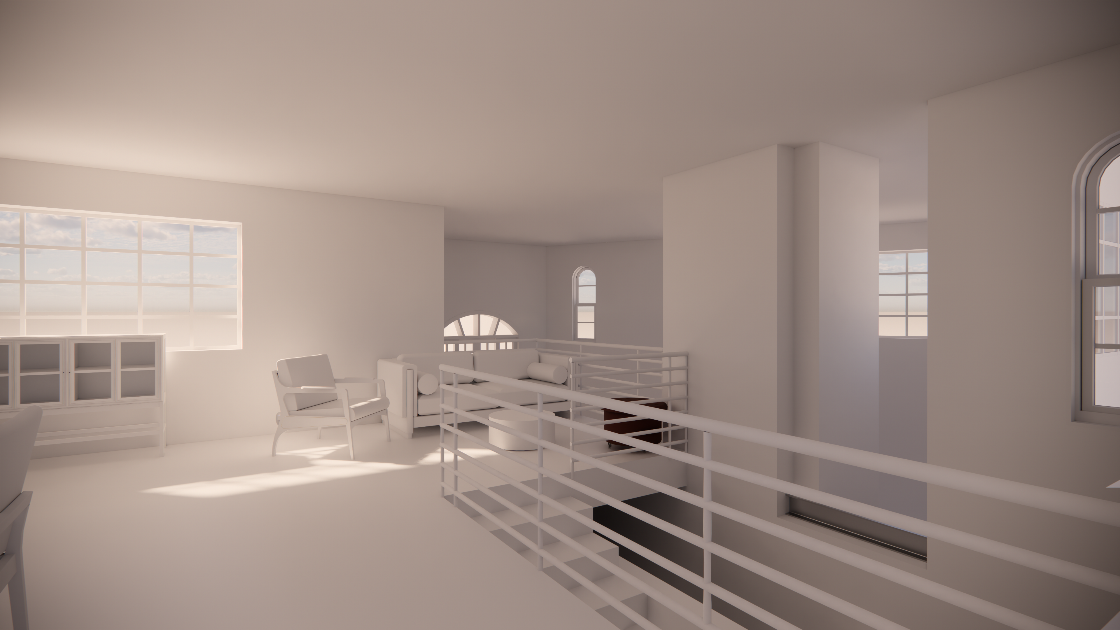 a modern minimalist interior with white walls and soft natural lighting the wood floors and windows are wood providing a clean and open look wood windows allow ample sunlight to fill the room reflecting off the glossy surfaces the furniture set includes sleek chairs and a table coupled with a dark wooden coffee table for contrast sky outside is a clear blue with soft clouds visible through the windows the atmosphere is serene and peaceful exuding simplicity and elegance replace metal railings with glass and wood railings