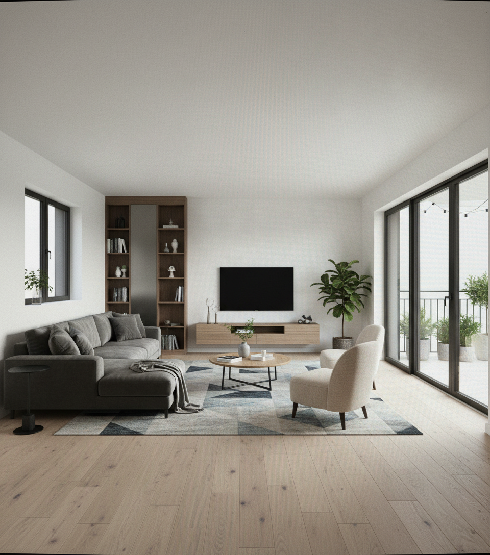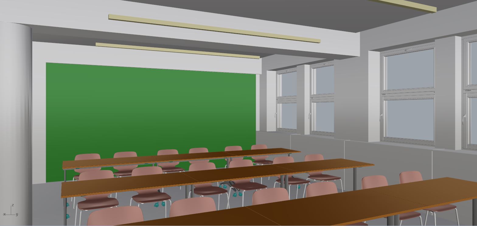 photorealistic interior render of a modern fresh and attractive conference room contemporary european office design high end architectural visualization clean and professional yet inspiring atmosphere the ceiling composition and all structural beams must be exactly identical to the reference image maintain the same ceiling layout proportions beam positions and construction logic as shown in the base reference image strictly follow the reference without creative reinterpretation floor finished with a uniform technical carpet in neutral grey color fine subtle texture matte finish seamless surface conference tables are flip top folding tables by narbutas featuring anthracite metal frames and white tabletops minimalist and functional clean sharp edges seating consists of babila chairs by pedrali all chairs in fresh vivid color tones fully monochromatic design legs and seat in the same color adding visual energy to the neutral space while remaining elegant and design oriented under the windows are custom radiator covers with white top board 18 mm thickness front vertical panels made of white fine perforated metal or white expanded metal precise detailing technical and minimal appearance apply a vertical vegetative plant wall to the area marked in green the green marked zone is fully covered with a dense yet refined living plant wall natural greenery with varied leaf textures fresh and healthy appearance the plant wall acts as a soft visual accent improving spatial atmosphere and adding biophilic character without overpowering the interior design lighting design includes warm ambient led lighting running in linear lines along the structural beams starting from the window side and continuing towards the opposite wall creating depth and a calm atmosphere en o primary suspended linear pendant lights slim and subtle warm white light evenly illuminating the conference tables large windows provide soft natural daylight balanced exposure realistic reflections global illumination soft shadows wide angle interior shot eye level camera professional architectural photography style ultra high realism sharp details no people no clutter