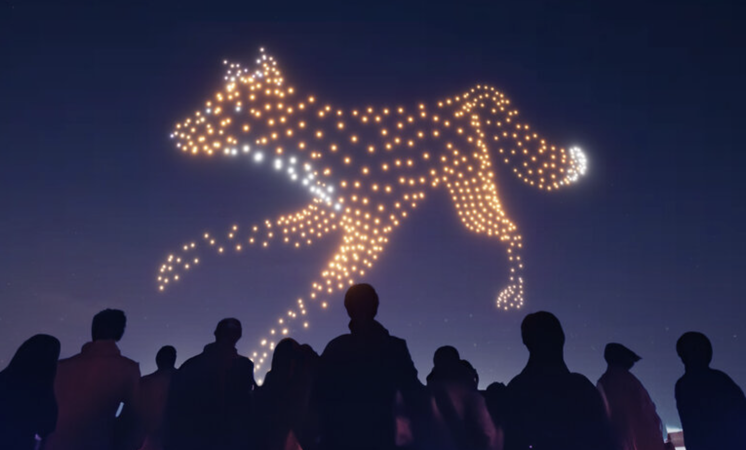 create a drone show image like this but instead of a fox make it letters that read be open in the drone dots design place the scene over a beach with a few palm tree and people sillouhettes