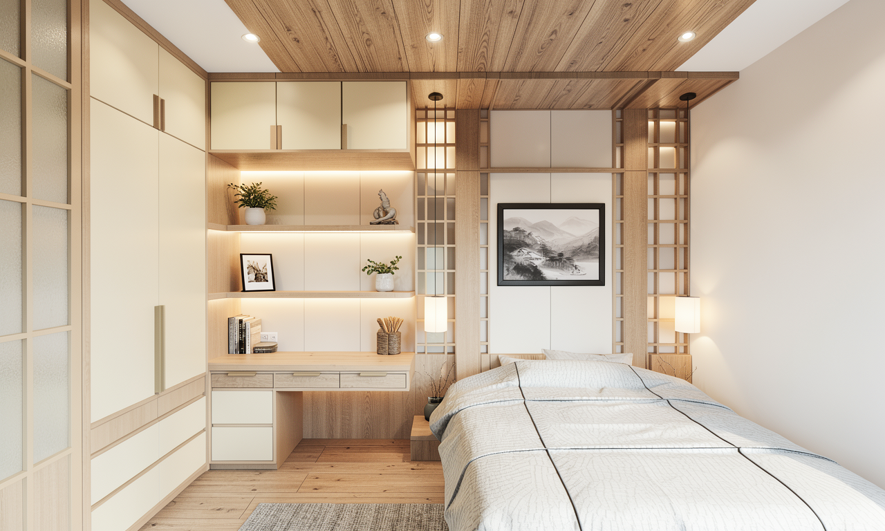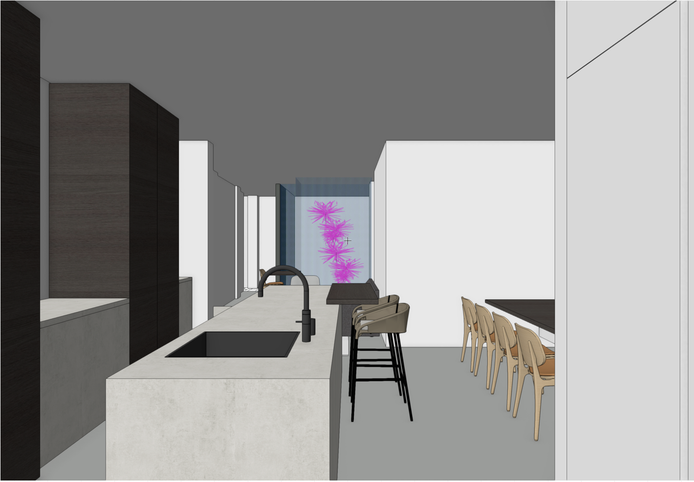 make from this plan a render in a corner in 3d render in the same colours as the plan add some minimalistic lightning above the kitchen counter add a plant on the left counter add a painting make the pink plant a dark green