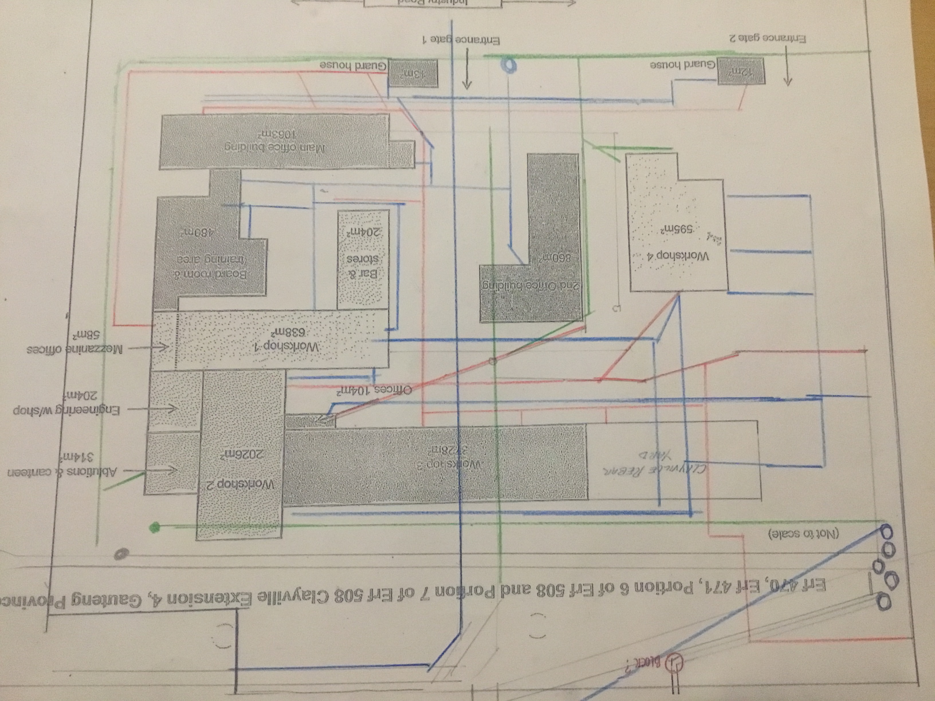 modernist exterior shot produce a utilities map for this factory the colours of each line need to be predominant as they represent blue for waterline red for electric line green for sewer line and rectangles and squares are the buildings architecture