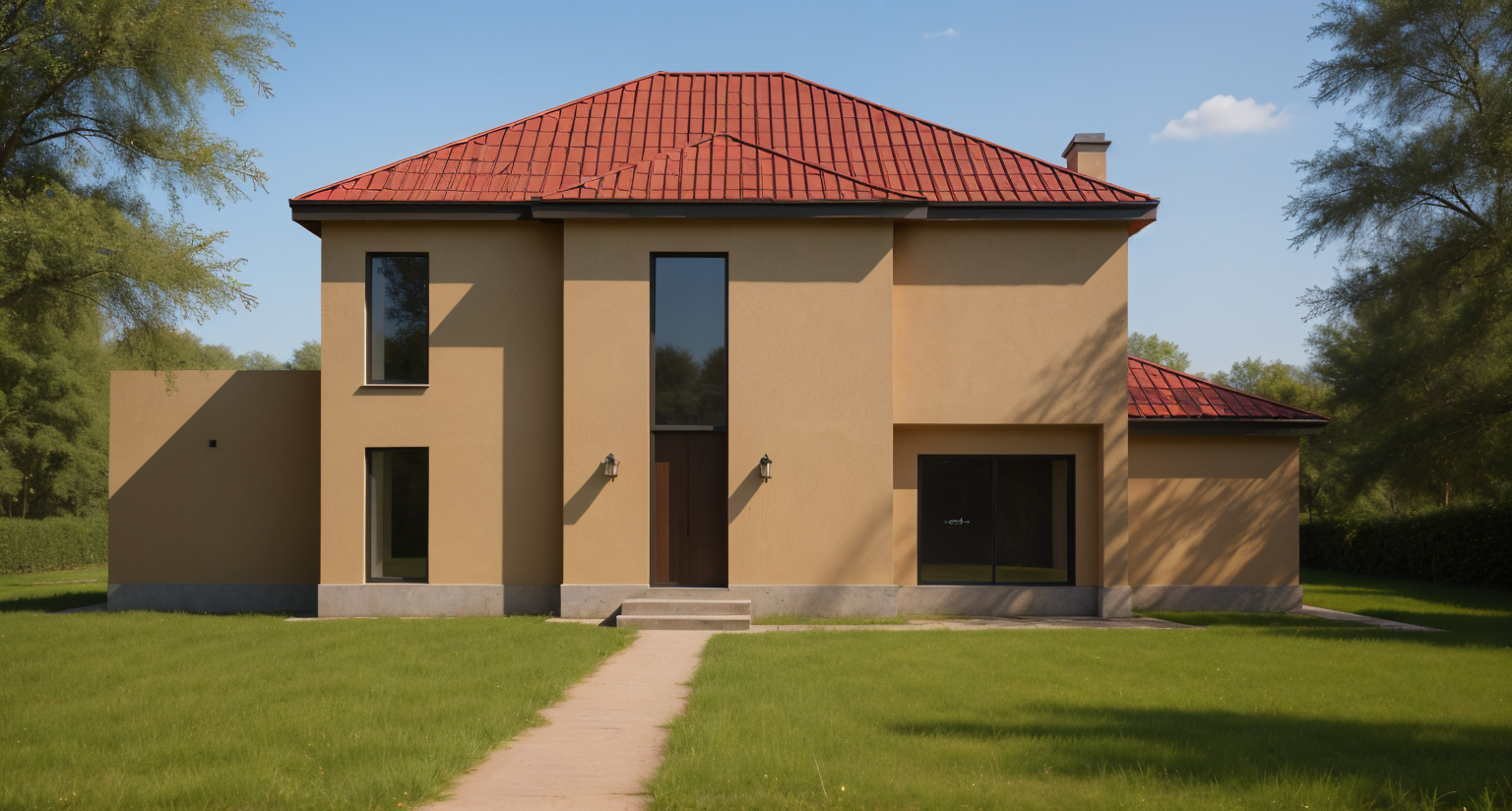 modernist interior shot urban street scene featuring a charming two story house with a rustic terracotta red facade and beige decorative elements surrounded by almond trees in bloom capture the vibrant sunlit atmosphere with a clear bright blue sky add realistic details to the house including intricate window patterns and wrought iron gates include parked cars with realistic reflections maintaining true to life perspectives create a lively neighborhood ambiance with warm welcoming lighting architecture