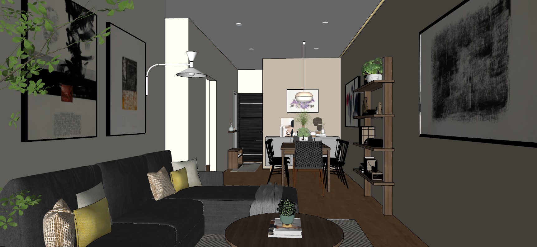 photorealistic interior render of a narrow contemporary apartment living dining space preserving all geometry furniture placement materials and camera setup exactly as defined critical lighting balance fix current error the current render is incorrect because lighting is too flat overexposed and lacks warm artificial presence the goal is daytime scene with clearly visible warm artificial lighting balanced contrast not flat not dramatic wall color control very important the wall on the right side and the back wall in the dining area must be warm beige tones leaning toward coffee brown slightly ated medium warm tone the walls on the left side must be the same hue family but clearly two tones lighter less saturated softer beige with a subtle warm undertone ensure visible contrast between left and right walls while maintaining a cohesive warm palette avoid flat uniform wall color differentiation must be perceptible but natural 1 daylight control it not dominant natural light enters primarily from the left side must be soft and diffused overcast moderate intensity reduce current brightness it should not wash out the scene avoid overexposed walls pure white surfaces loss of contrast additional opening on the left side next to the door on the left side there is a tall vertical window this window must introduce soft natural light only in that localized area de la puerta this light must be subtle and contained it should not flood the entire scene only gently illuminate the wall and floor near the door creating a localized soft natural accent 2 ceiling spotlights bring them back all recessed spotlights must be on warm 3000k increase their intensity slightly compared to current render they must be clearly visible as active light sources create gentle pools of light on ceiling and floor add depth and contrast 3 led strip correct behavior key fix keep led strip on right ceiling on 3000k but correct its behavior it must produce a soft diffused glow not a sharp bright line slightly reduce intensity compared to previous version the one with wall wash it should light the ceiling edge subtly add warmth enhance depth very important it can softly affect the wall but only minimally no strong wall washing no vertical glow effect no bright streaks on the wall think ambient accent not feature lighting 4 remove current errors the current image must be corrected by removing overexposure restoring contrast reintroducing warm tones avoiding flat lighting 5 target look very clear intent the final render should feel like a real photograph taken during the day interior lights are on and visible warm neutral balance soft shadows defined depth not washed out all white flat cold 6 exposure control very important slightly lower overall exposure preserve highlight detail no clipping maintain midtone contrast keep natural dynamic range 7 final lighting relationship daylight base illumination spotlights visible and shaping space led subtle accent ninguna debe desaparecer ninguna debe dominar additional realism constraints avoid light leaks avoid unrealistic bounce light maintain physically plausible lighting behavior