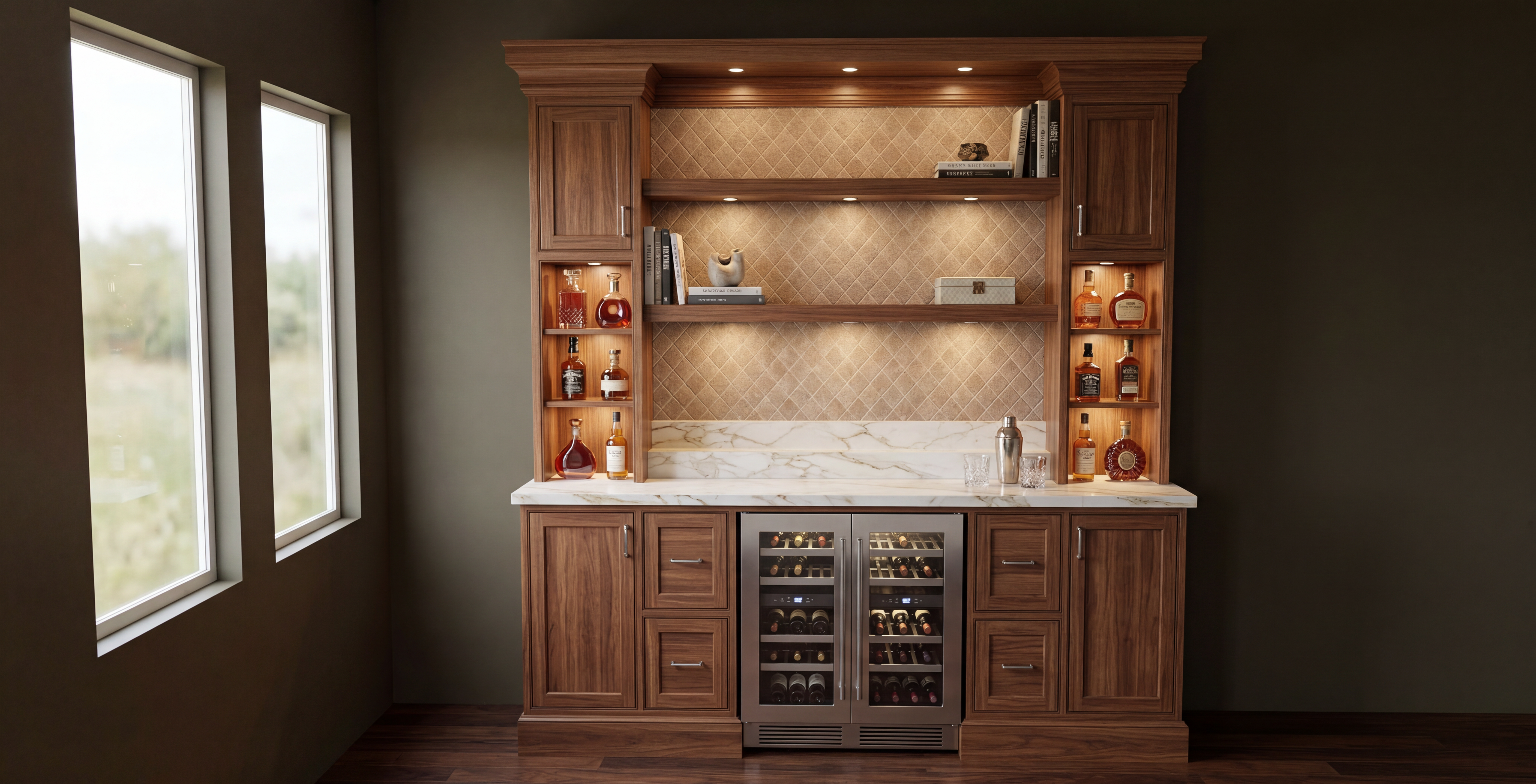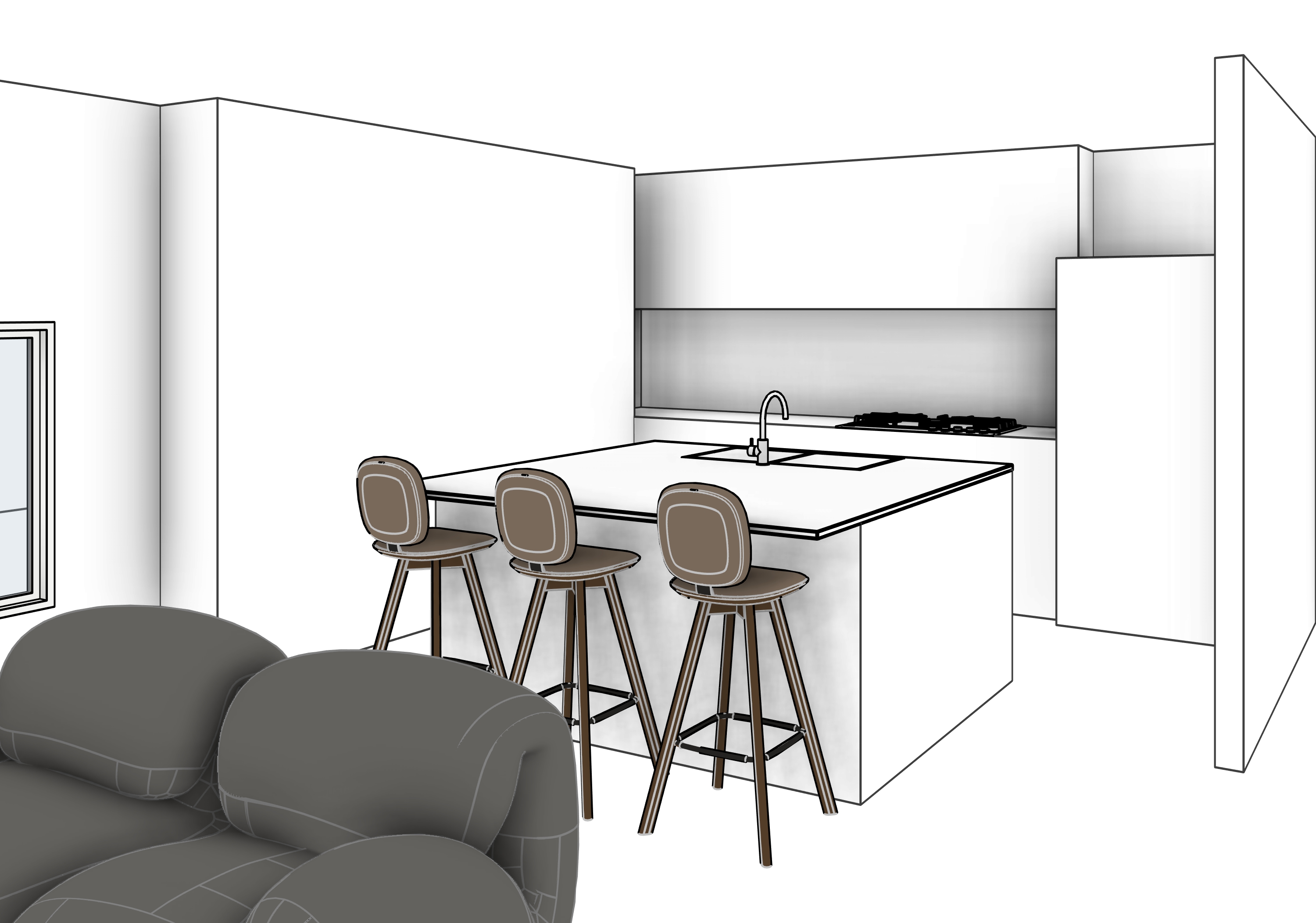 use the provided kitchen image as the unchanged base reference keep the overall layout camera angle and proportions and only enhance materials lighting and realism a calm contemporary kitchen interior with pale timber joinery soft neutral stone benchtops streamlined integrated appliances and simple sculptural pendant lights over a generous island emphasise a warm natural palette clean lines minimal hardware and comfortable upholstered stools to convey a refined yet relaxed residential atmosphere enhance soft daylight gentle shadows subtle reflections and fine material texture for a photoreal high resolution client presentation render that feels inviting airy and sophisticated