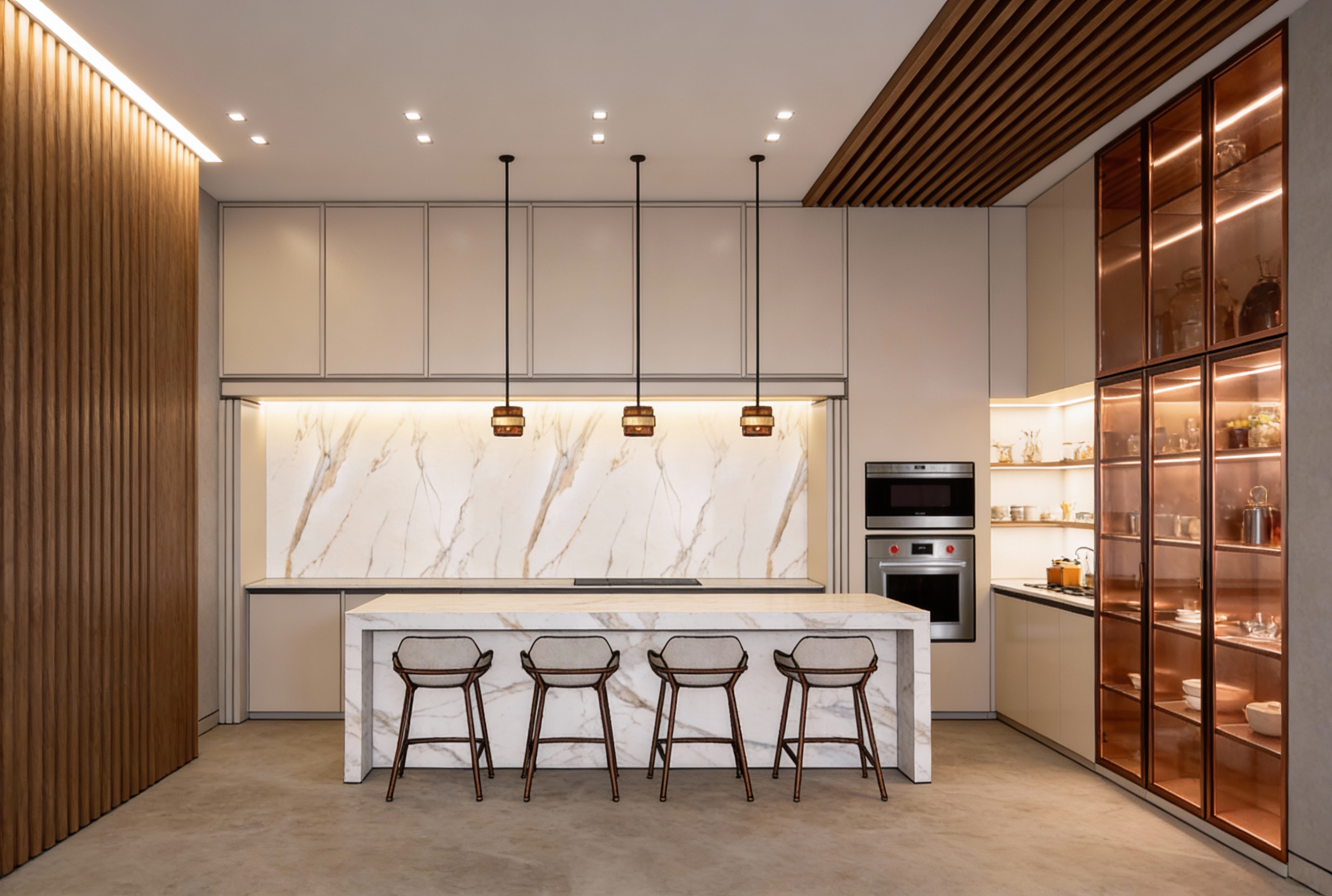 ultra realistic interior kitchen rendering shown from a wide angle perspective focused on the sink wall and adjacent island with a clear view of the window backsplash base cabinetry island edge and tall pantry units the kitchen features a consistent combination of light natural oak wood cabinetry and soft white shaker style cabinetry using the exact same wood tone as the main kitchen cabinetry described previously the wood finish is a light oak with warm undertones subtle natural grain variation and a matte low sheen finish reading clean and natural not yellow not gray and not overly rustic on the left side of the scene a full height floor to ceiling pantry cabinet wall is finished in this same light oak wood tone with integrated doors clean panel detailing and concealed storage forming a strong vertical volume consistent with the rest of the kitchen along the main wall white shaker style base cabinets extend continuously beneath the countertop featuring clean recessed panels and slim brushed brass bar pulls evenly aligned and horizontally oriented the cabinetry color remains soft white with warm undertones complementing the oak without contrast the countertop is a solid off white surface smooth and matte with very subtle veining extending seamlessly along the wall and wrapping into the island in the foreground maintaining material continuity centered beneath the window a single bowl undermount sink is installed paired with a brushed brass gooseneck faucet with a refined minimal profile above the counter a large rectangular window with white trim provides soft natural daylight the backsplash consists of vertically stacked rectangular tiles in a muted sage green tone desaturated and calm with minimal grout lines the vertical layout adds texture and height while remaining understated and cohesive with the oak and white palette in the foreground a large kitchen island is partially visible finished in the same light oak wood tone as the tall pantry cabinetry topped with the same off white solid surface countertop reinforcing consistency across all views of the kitchen on the right edge of the image a portion of the white upper cabinetry is visible matching the same shaker detailing and brass hardware used throughout the flooring throughout the kitchen is medium tone natural wood planks laid lengthwise with visible grain that complements the light oak cabinetry without competing with it lighting is soft even and neutral consistent with architectural visualization standards the overall aesthetic reflects a sketchup style architectural 3d render characterized by clean outlines simplified geometry crisp edges and flat yet realistic materials maintaining accurate proportions and a refined uncluttered composition no elements are added or altered the scene remains fully faithful to the original image and material consistent with the first kitchen prompt