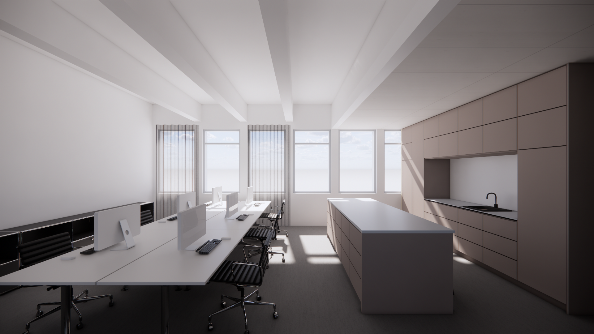 do not adjust image view or scale of elements do not add extra elements unless specified add wood plank floor texture island and sink countertop grey black stone with small texture kitchen cabinets should be colour wood computers should be max and silver shelves near the white wall should be black chairs should be chocolate brown outside should be row of office buildings in iceland