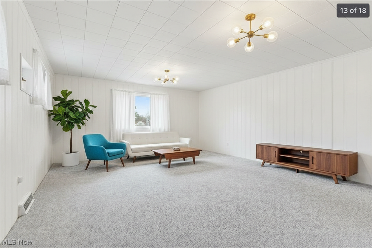 paint the walls of this room to be beige add a queen sized bed with white bedding a fashionable walnut dresser plants and framed photographs for decoration replace the grey rug with a large modern white rug add a nightstand with a lamp