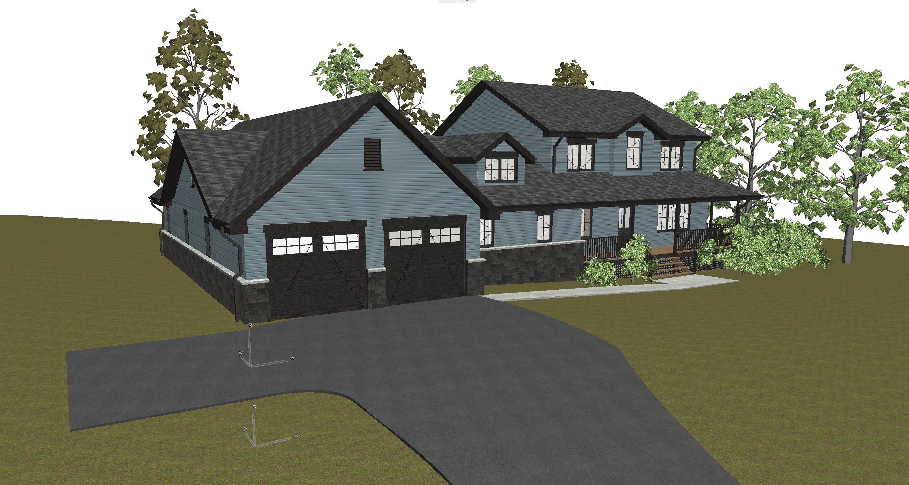 photorealistic rendering of house with low tree covered mountains in the background maintain exact colors from source image siding is blue gray