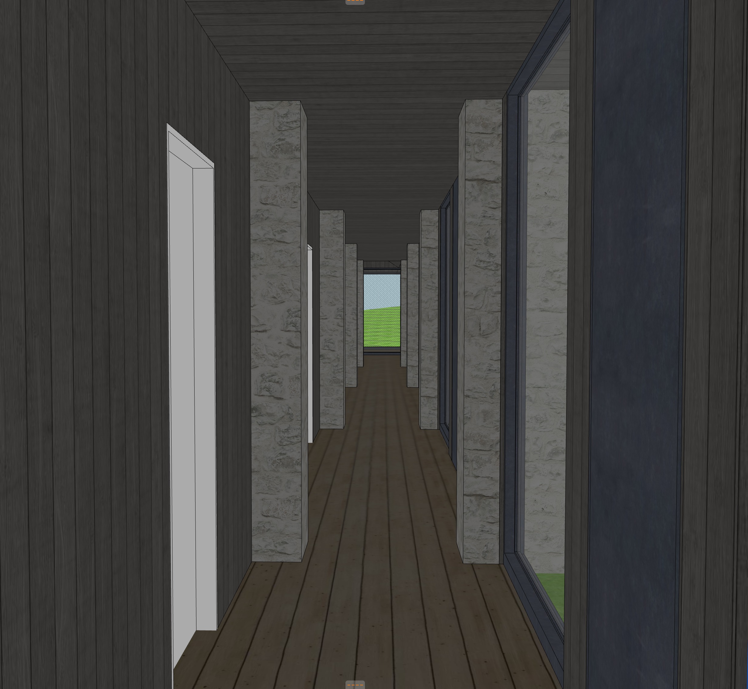 lightly textured white stone on the pillars wood texture on doors to match wood texture on walls floor to ceiling window at end of hallway