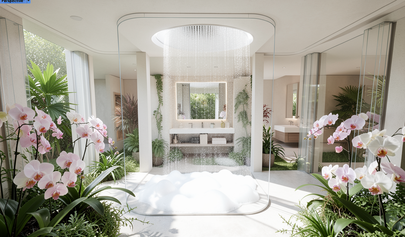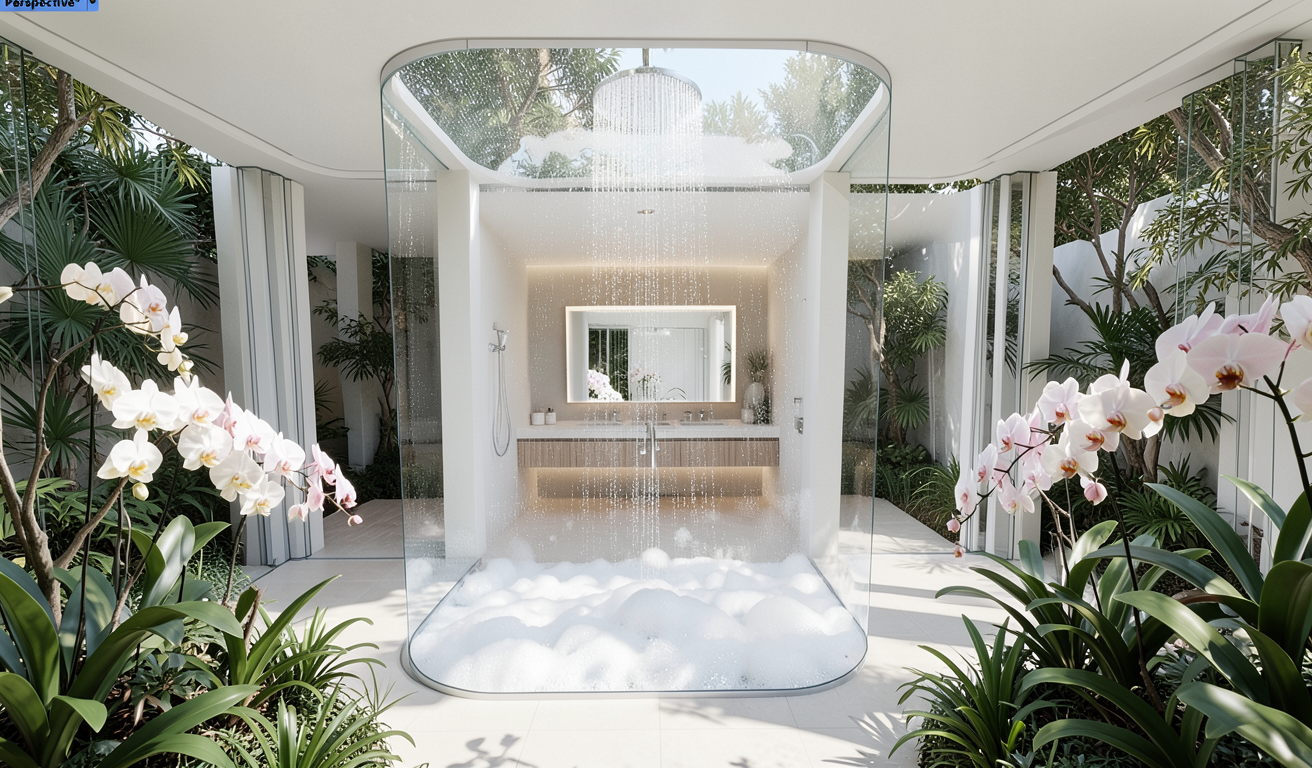 same composition shower bubble is outdoors in open air patio not inside the bathroom surrounded by greenery and orchids plants foreground slim mullions framing the view interior vanity niche visible beyond bright natural daylight outdoor orchid patio viewpoint plants foreground slim glazing mullions rain shower bubble outside in the patio looking through it to an interior double vanity niche with large mirror bright daylight minimal