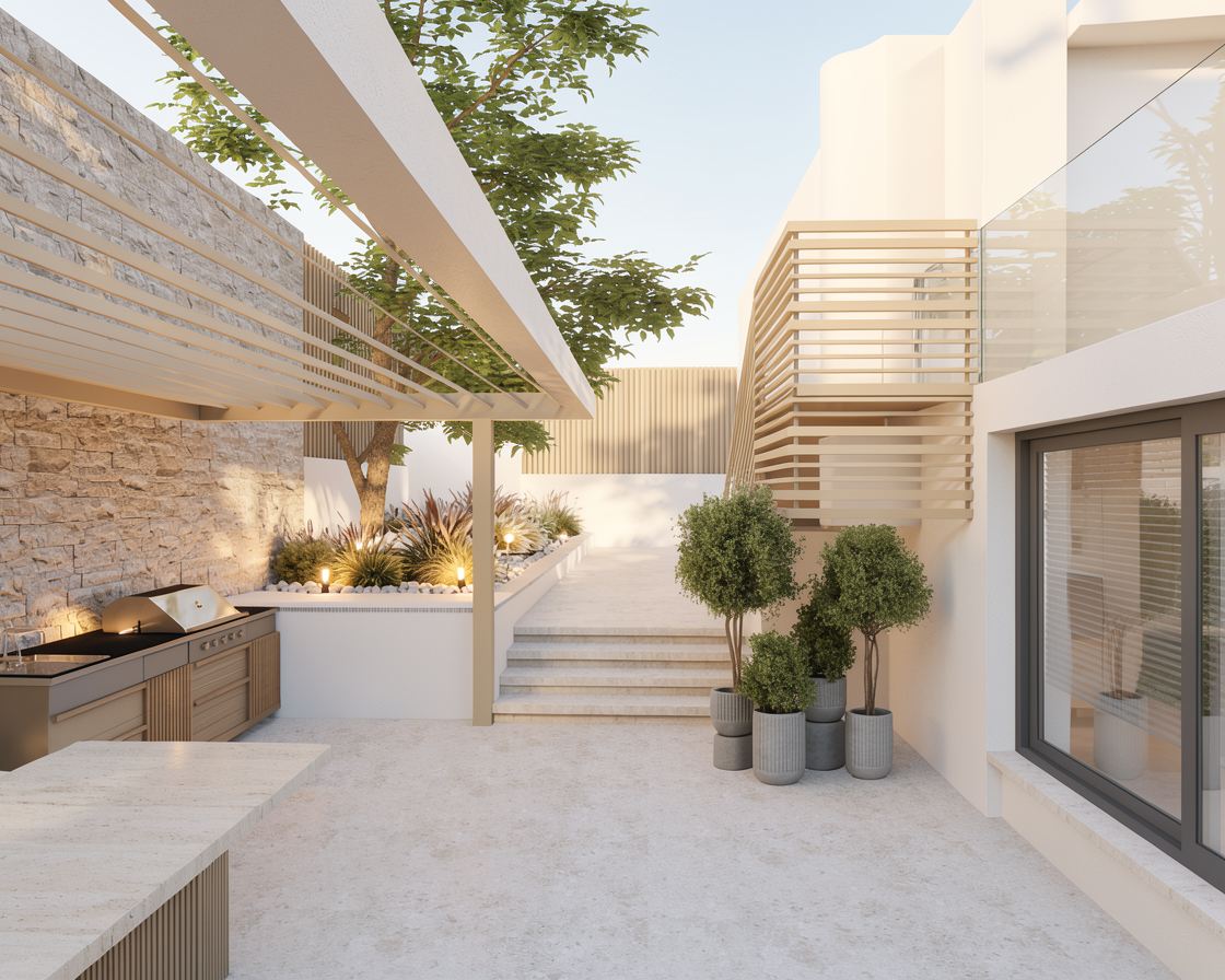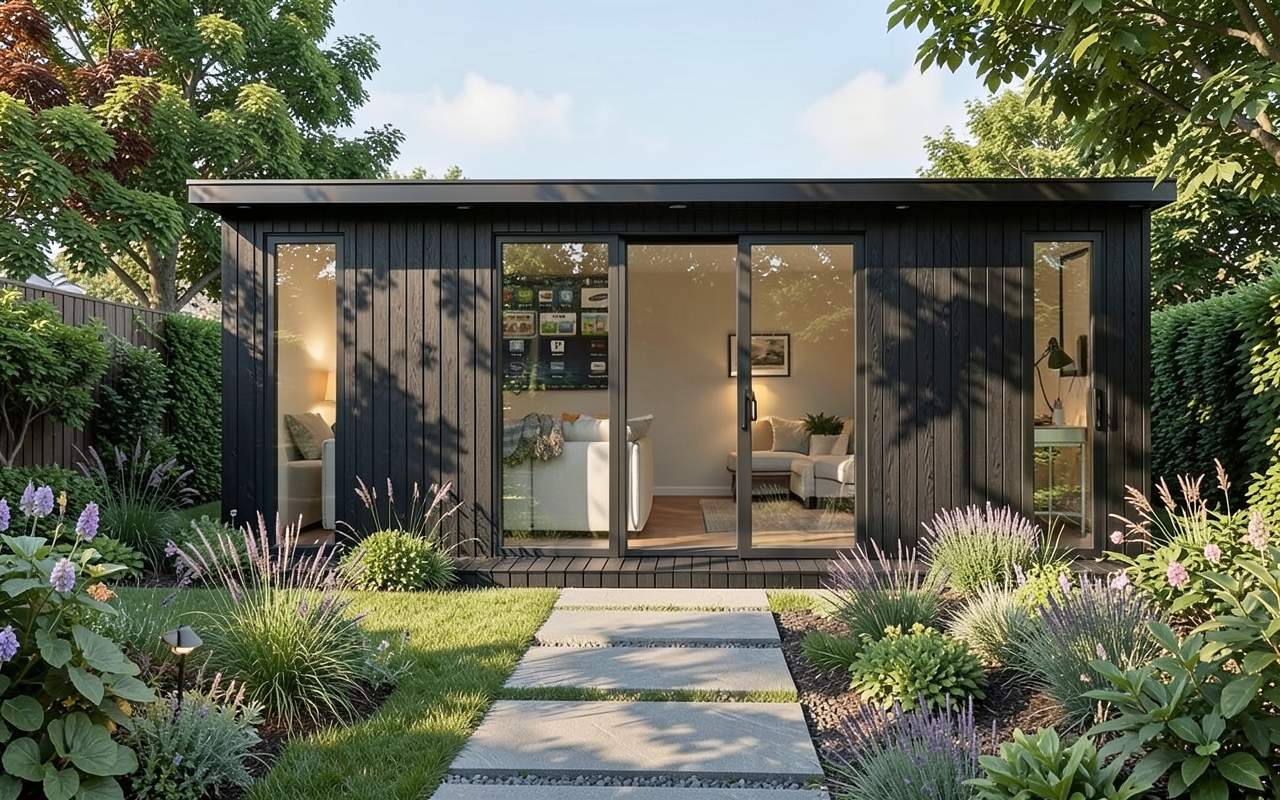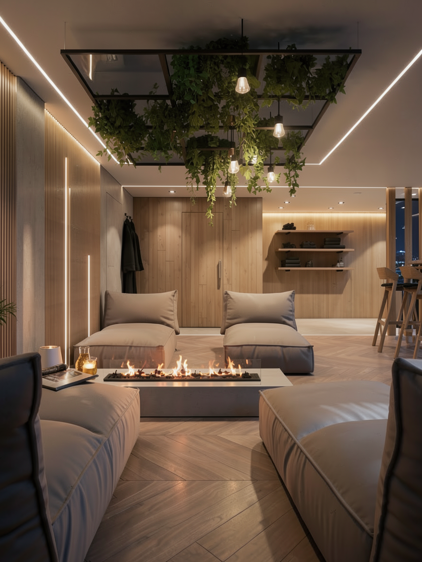 this is pavilion the pavilion is constructed from corten steel locate it in a green urban park surrounded by deciduous trees and a natural landscape the architecture is minimalist light and open include urban lighting no buildings around