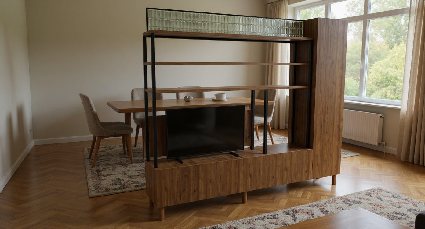 warm kitchen with a light white oak kitchen cabinets stainless steel appliances marble countertops on a sunny day back behind the sofa is fabric seating