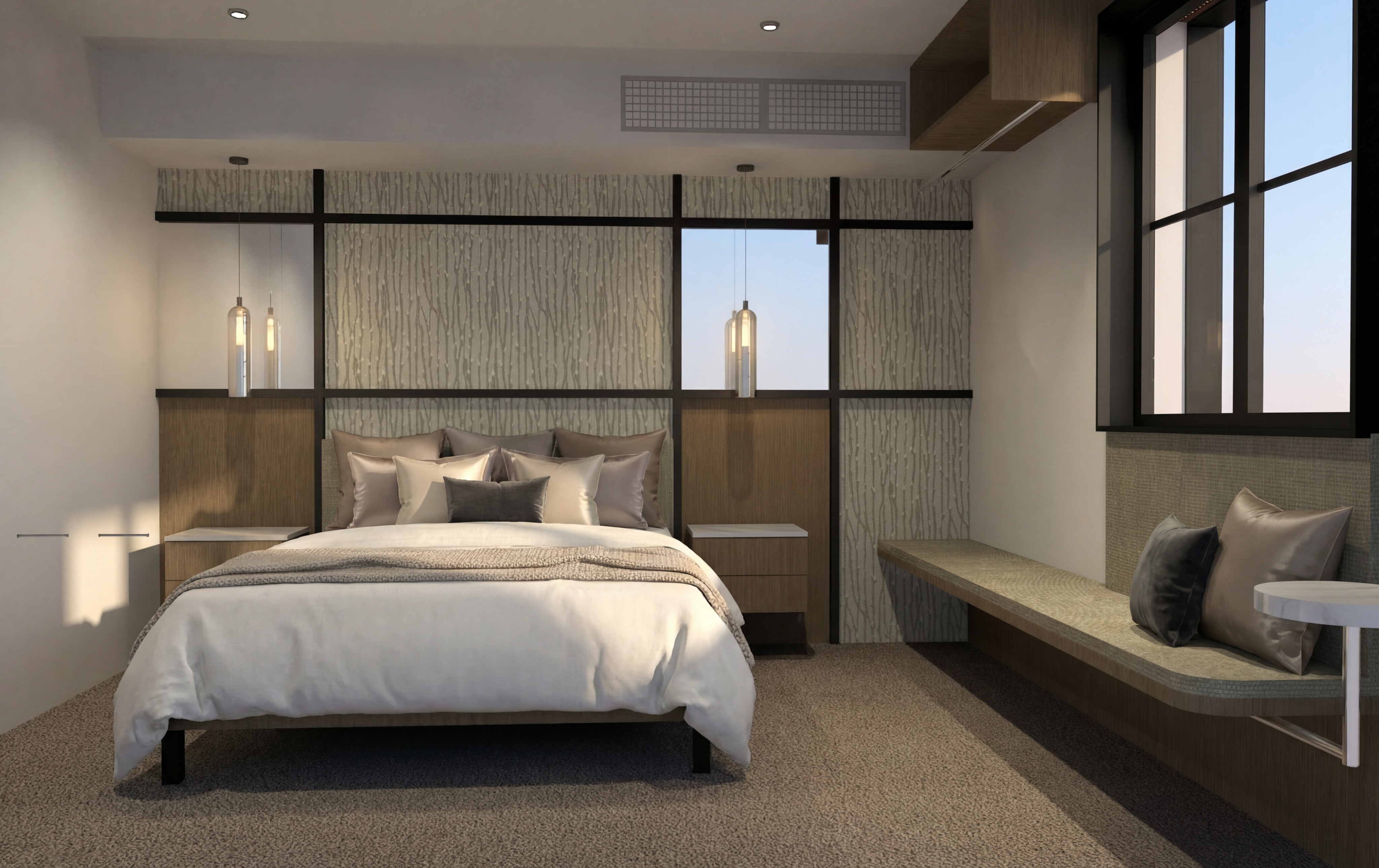 keep all existing textures and finishes provide cushioned seating to bench seat under window in same texture