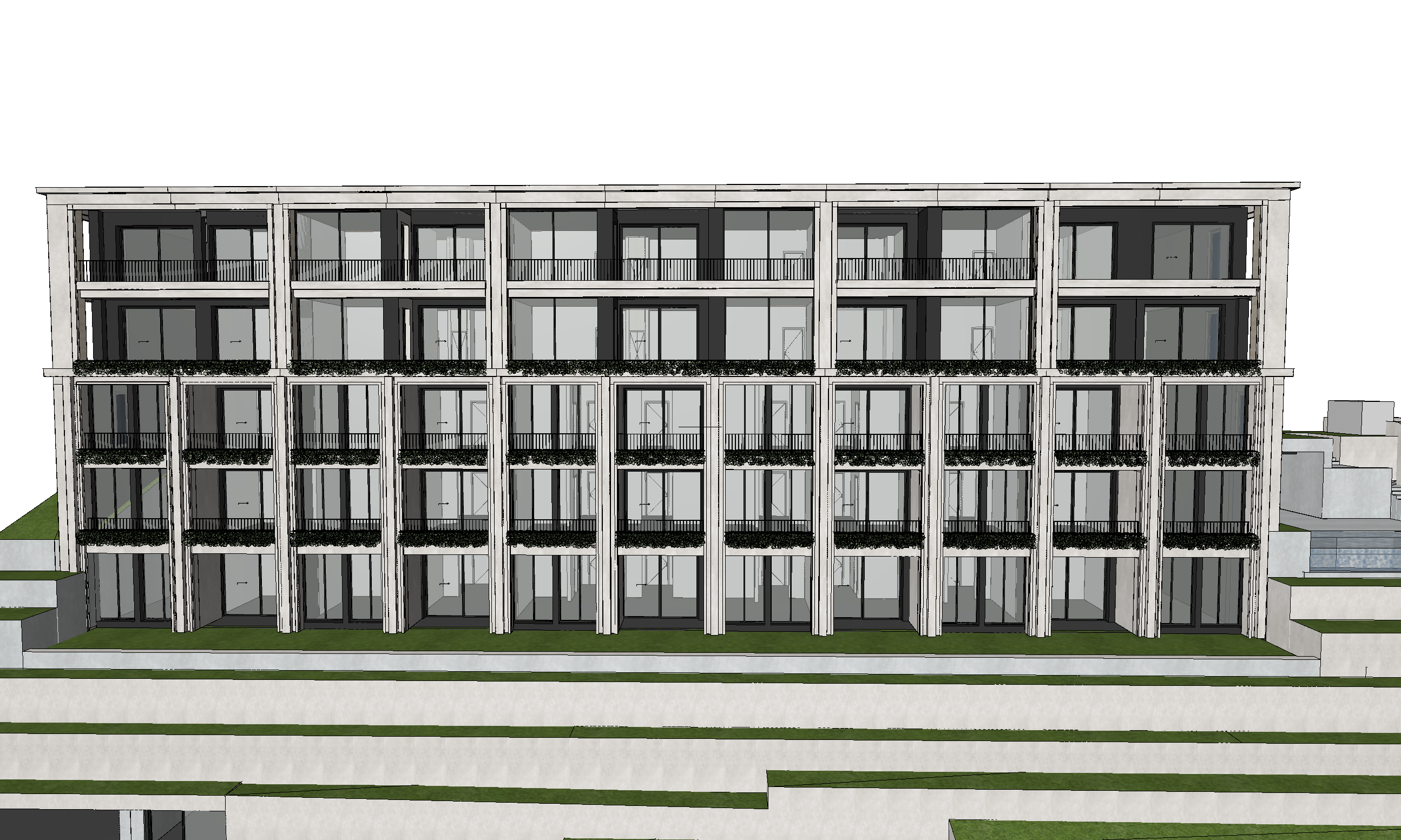 render a modern elegant apartment building with tall white columns and glass windows reflecting the light the glass should be a soft transparent blue giving a serene appearance the balconies feature lush green plants to add a natural touch the atmosphere is bright and sunny highlighting the sleek lines and architectural details of the building the grass is a vibrant green contrasting with the light gray concrete steps the lighting should be warm creating a welcoming and luxurious ambiance