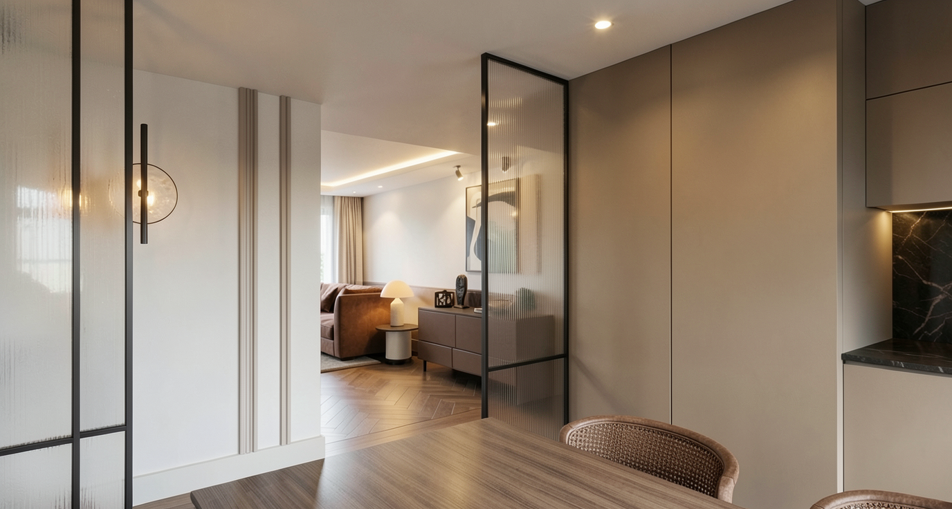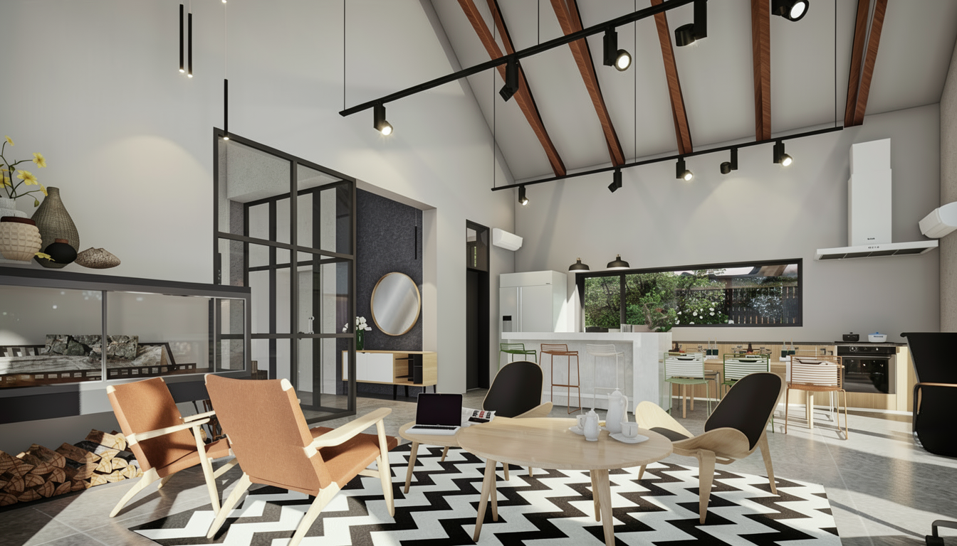 render a modern apartment floor plan showcasing a cozy and inviting atmosphere use soft warm lighting to enhance the space the kitchen area should have sleek white cabinets with chrome fixtures and a light gray backsplash the dining area with two chairs and a round table should be in light wood complemented by soft beige upholstery the bedroom features a large comfortable bed with a plush white duvet and pastel throw pillows use light oak for the flooring throughout and add soft green potted plants for a touch of nature the walls should be a calming light gray creating a serene environment