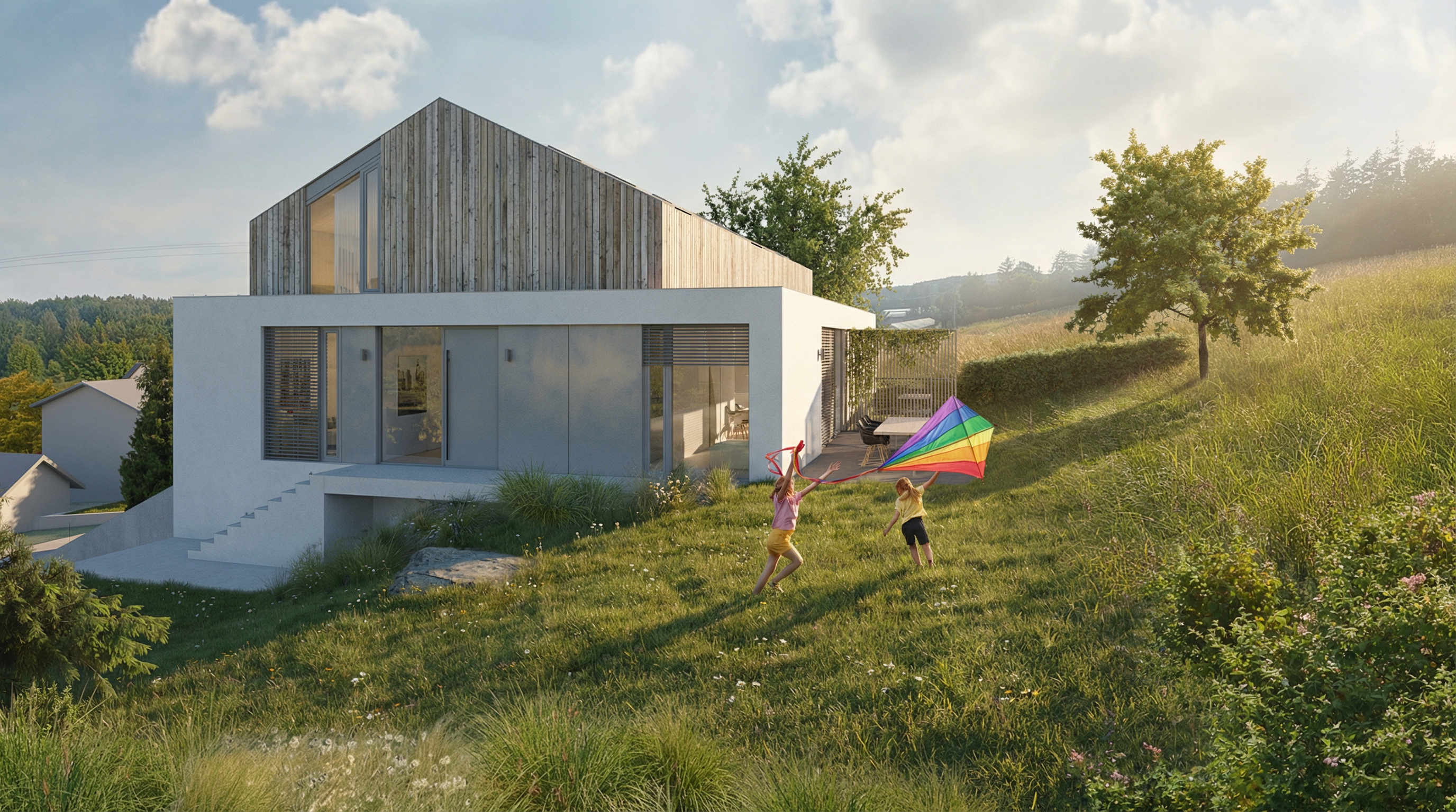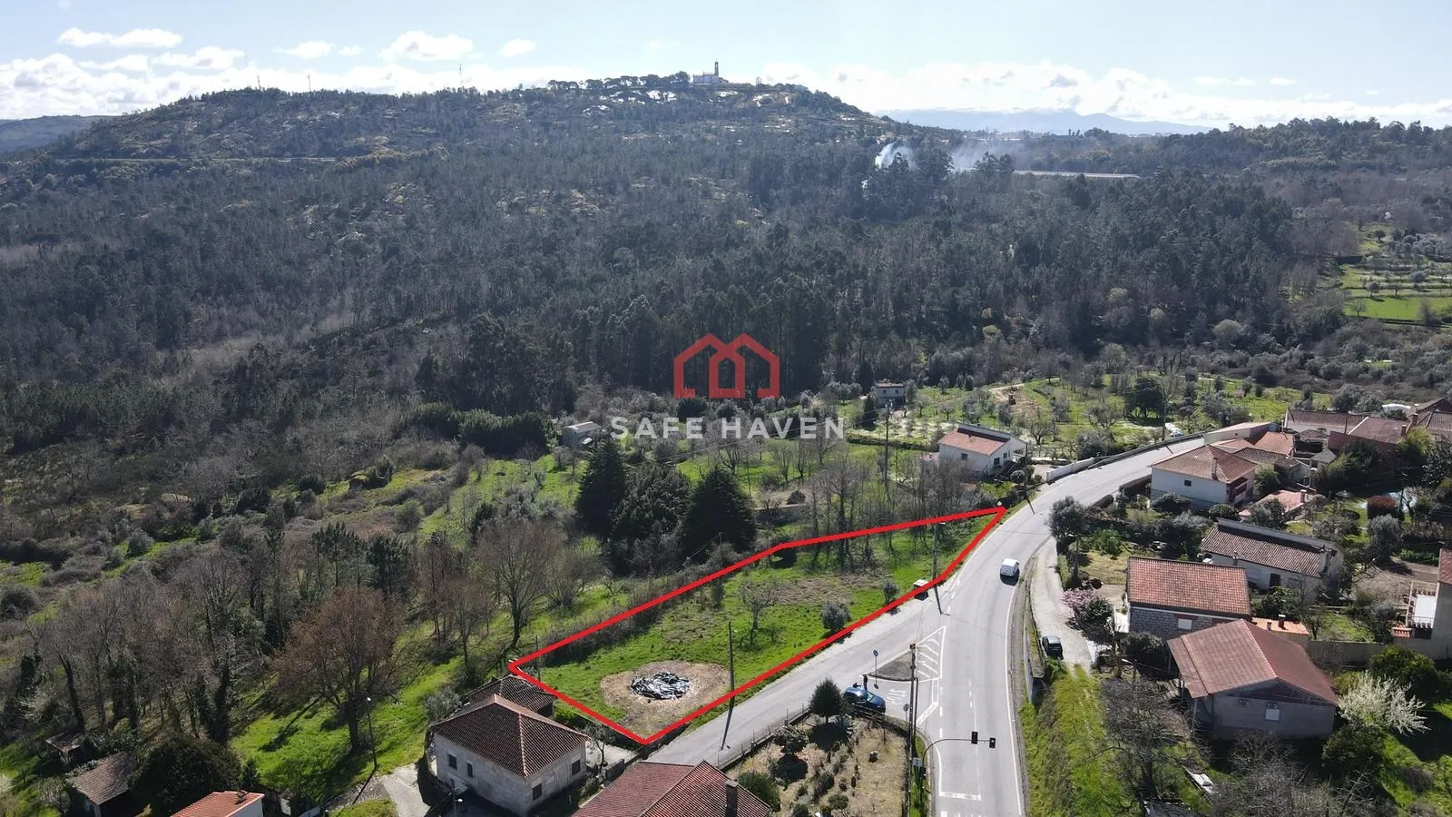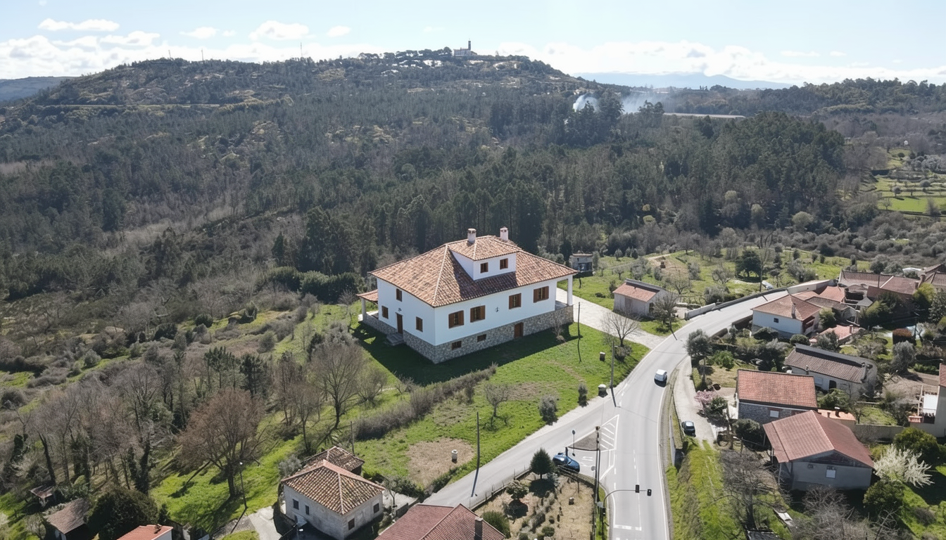insert a single storey ground floor only medium sized three bedroom house within the triangular plot shown in the aerial image fully respecting the exact shape limits and orientation of the land the house should have a compact and well proportioned footprint and be positioned to face the road adapting naturally to the terrain the architectural style should be traditional inspired by portuguese vernacular housing with white plastered fa ades a pitched roof covered with traditional ceramic tiles stone or granite details on the base and around openings and wooden or wood look window frames the layout should include three bedrooms a comfortable living and dining area a traditional style kitchen and supporting bathrooms all organized on a single level include a modest covered garage or carport integrated into the house design the surrounding land should remain mostly natural and rural preserving existing vegetation with simple paths and minimal landscaping the final image should be a highly realistic architectural visualization shown from an aerial or topographic perspective consistent with the original drone image under natural daylight with no visible plot boundary lines or graphic markings