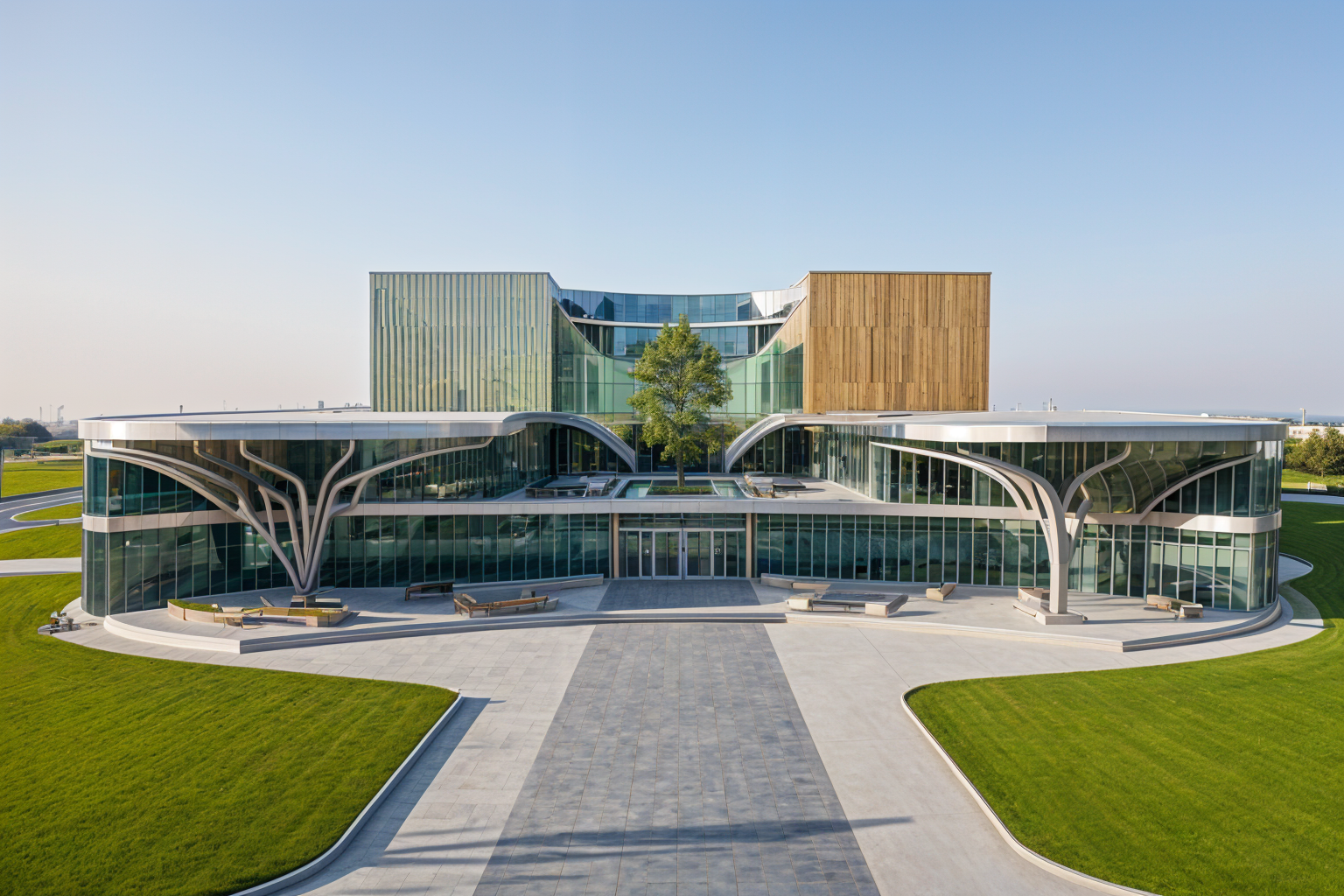 photorealistic 3d exterior render of a modern craftsman home with multiple gables charcoal gray siding warm wood accents in gable above garage and above porch stone veneer black shingles black framed windows double garage covered front porch landscaped suburban lot daytime lighting blue sky realistic materials