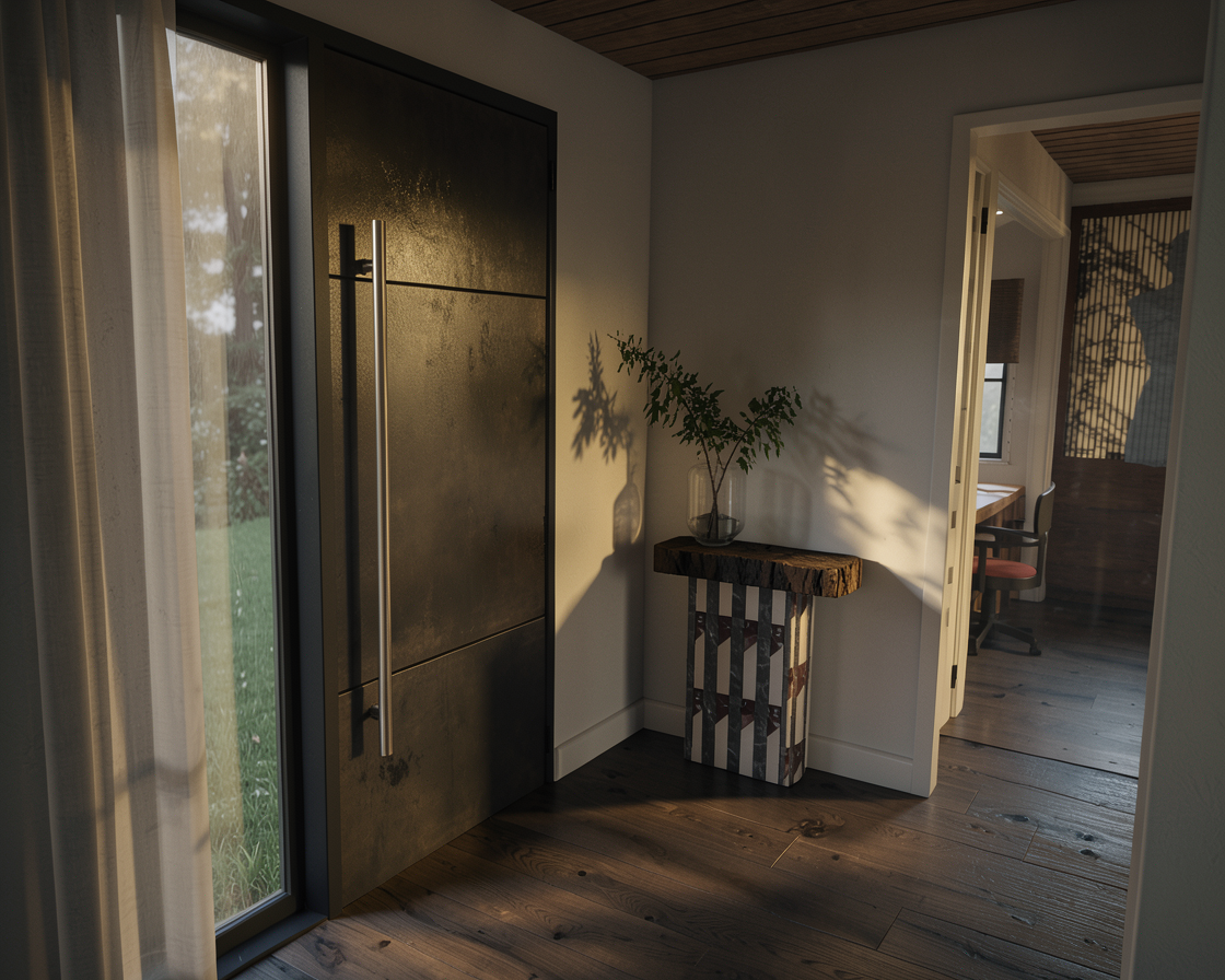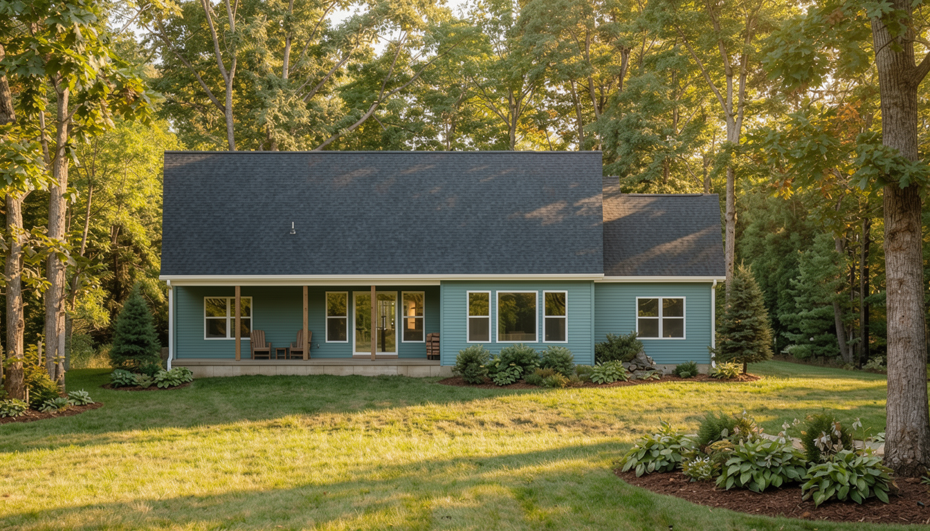 make a modern farmhouse look with white trim black windows black roof shingles neutral stone using darker blue gray color set in an urban area
