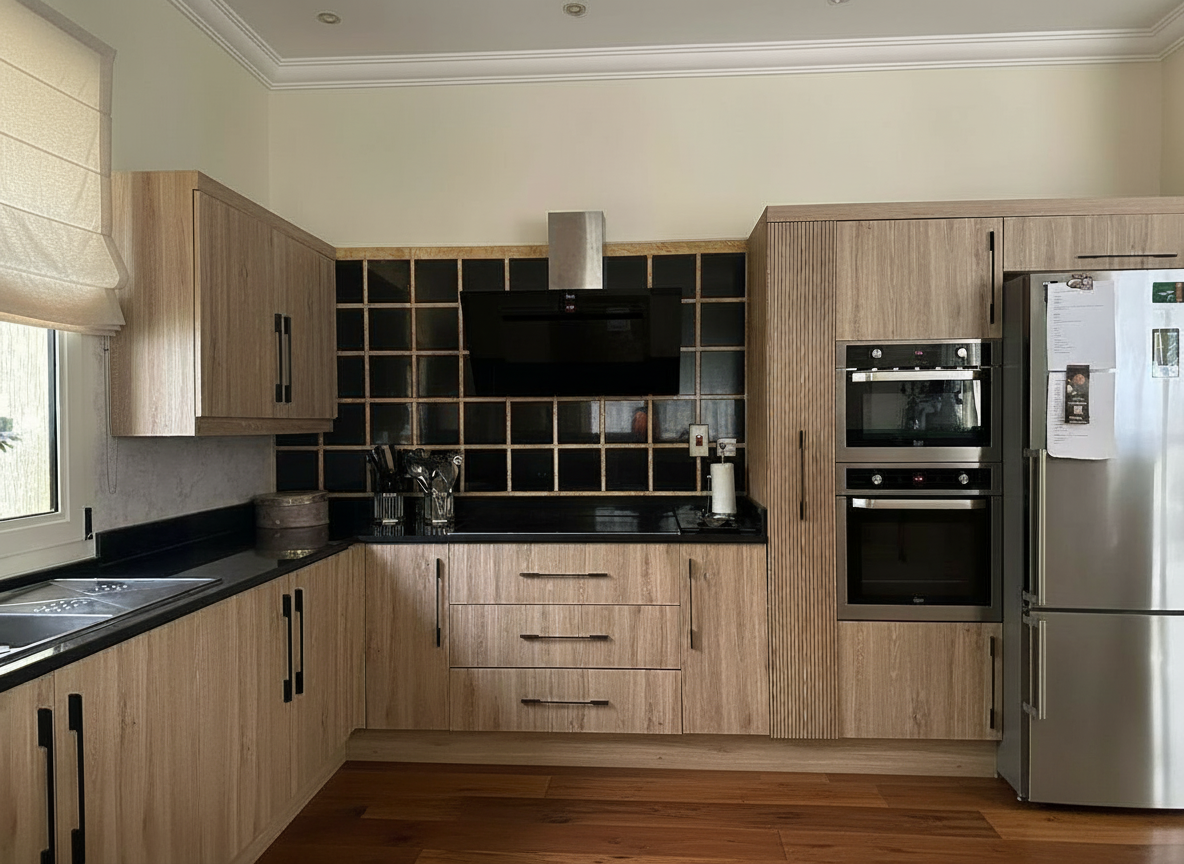 make as photorealistic as possible while keeping textures the same as selection professional landscaping in a lightly wooded scene with good lighting match materials to plan sw6073 perfect greige horizontal siding black gutters black windows black trim black roof black louvered shutters