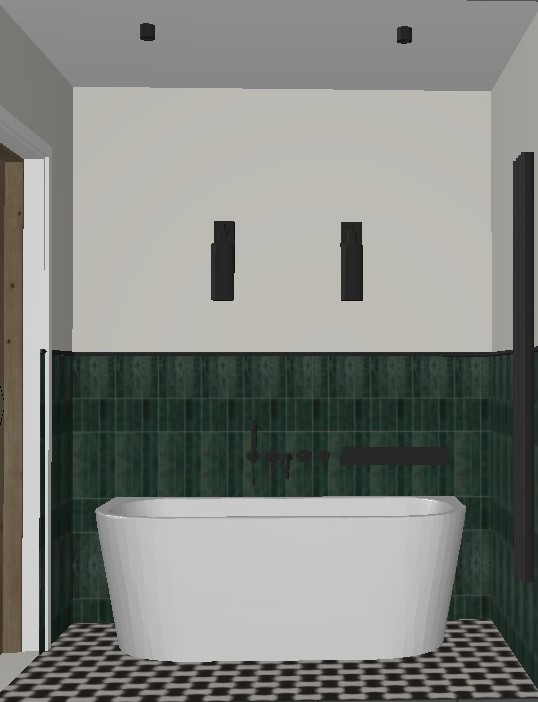 bathroom render keeping the colors style and textures as in the previous shot make sure that the fittings by the bathtub are black the floor should also be kept in the same color scheme i e beige and black in a checkerboard pattern there are lamps on the walls add a slightly atmospheric cozy light to them