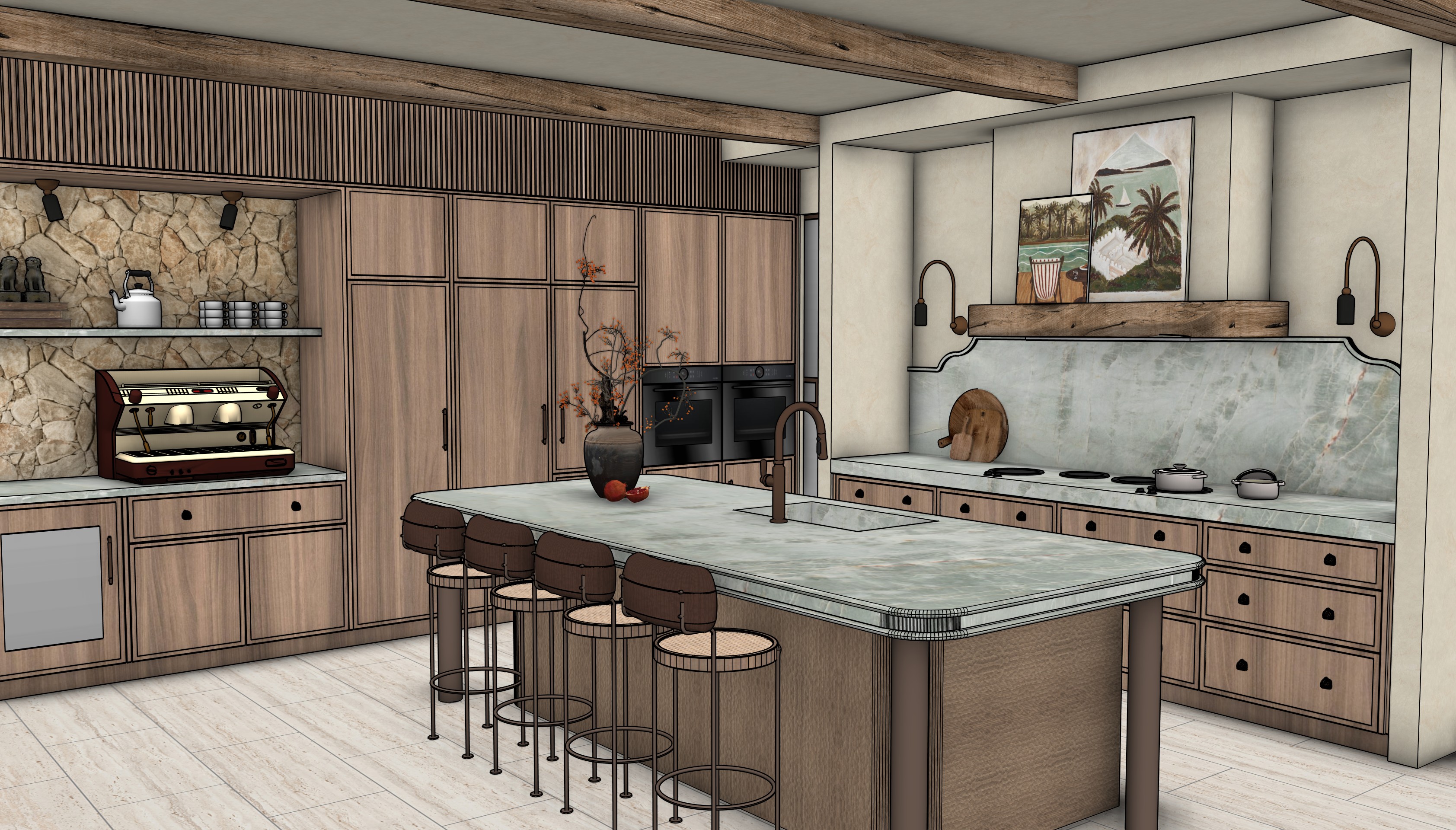 the cabietry timber is a soft mid tone not dark the kitchen island legs are a bronze the green the benchtops splashback stone is a soft light muted emerald quartzite walls ensure kitchen island stone benchtop edges are all quartzite and ceiling are a warm off white limewash pantry door is bronze fame with cathedral flemished glass insert
