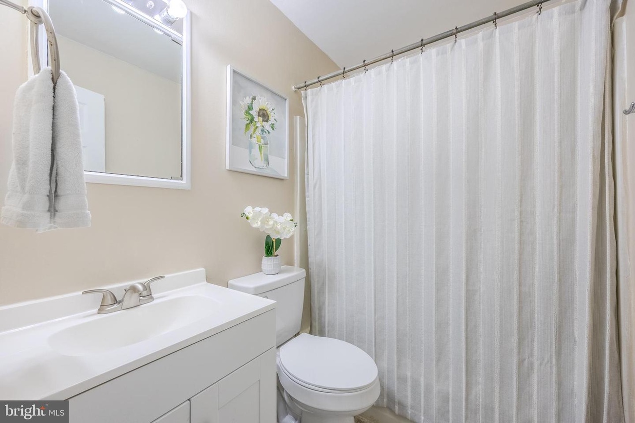 show me a renovated bathroom with a new dark vanity with sconces and a mirror and white subway tile around the tub and gray 12x24 tiles on the floor