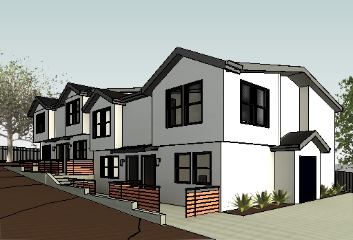 white stucco exterior black windows trim black fascia black gutters black door metal awnings wood and metal railings grass in foreground concrete driveway partly cloudy background sun is directed at front corner asphalt shingle roofing