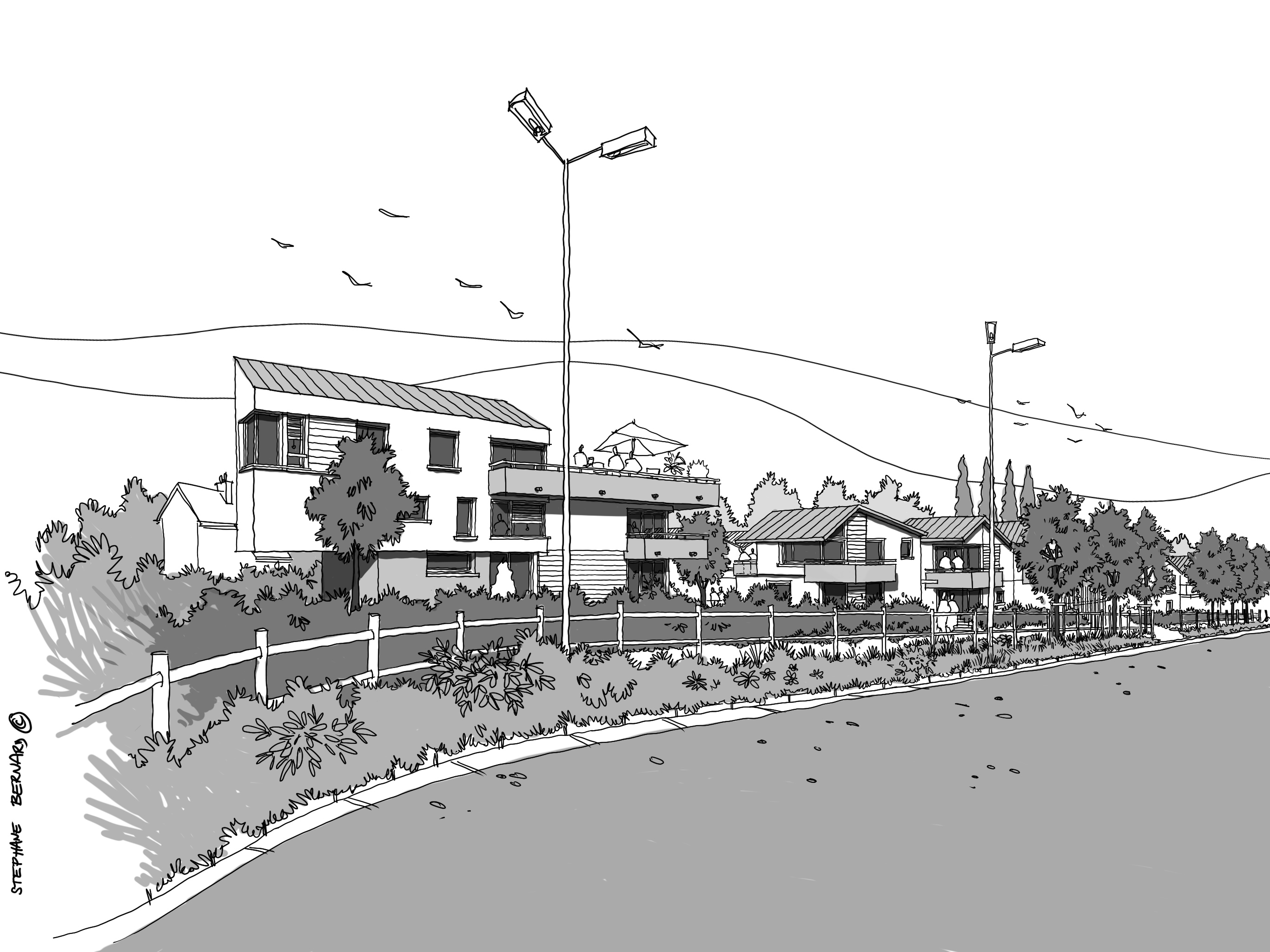 transform this architectural sketch into a high quality watercolor rendering while strictly preserving the original perspective composition and proportions style soft and realistic watercolor illustration subtle brush strokes light washes and natural blending of colors architecture modern residential buildings with clean lines rendered with light grey to medium grey plaster facades subtle variations in tones roofs in dark grey metal standing seam or steel sheet appearance materials matte finishes slightly textured plaster refined and contemporary look environment enhance the vegetation with natural watercolor textures soft greens and organic shapes maintaining a light and airy atmosphere sky bright blue sky with soft white clouds watercolor effect life add a few pedestrians walking casually along the street and sidewalk in a discreet and natural way lighting soft daylight slightly warm with gentle shadows to give depth while keeping a calm and elegant mood overall mood architectural presentation watercolor clean serene minimalistic professional and atmospheric