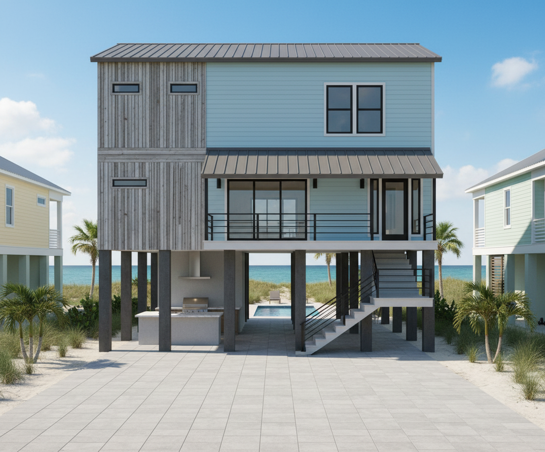 create a photorealistic rendering of a two story elevated modern coastal home exactly matching the provided architectural elevation architecture materials upper level light blue horizontal siding with two double hung windows lower level and left wall sections natural or weathered vertical wood slat paneling all window and door frames must be black use a gable roof only no hip roof standing seam metal in galvanized or matte gray with the same pitch used on both the main roof and porch overhang include black horizontal railings on balcony and stairs under house outdoor living space entire underside of the elevated home should remain open no enclosed walls install a built in outdoor kitchen bar positioned at the rear side closest to the pool finished in coastal modern materials like stucco or stainless steel hardscape landscaping install a solid paver driveway no grass strips or gravel using light gray or ivory pavers continue the same pavers beneath the home and across the entire backyard extending to the pool deck landscaping should be minimal and tidy with low maintenance coastal grasses and dwarf palms pool requirements extremely specific the swimming pool must be a perfect rectangle it must run parallel to the back of the home it must span the full width of the home from one side to the other matching the home s footprint surround the pool with the same paver material as the driveway setting location place the home on a dry inland lot on fort myers beach no water or ocean visible in the background surround the home with other nearby elevated coastal style houses typical of fort myers beach neighborhoods lighting bright daytime florida sunlight with clear blue sky and crisp shadows overall style modern florida coastal stilt home with minimalist scandinavian influence and seamless indoor outdoor living