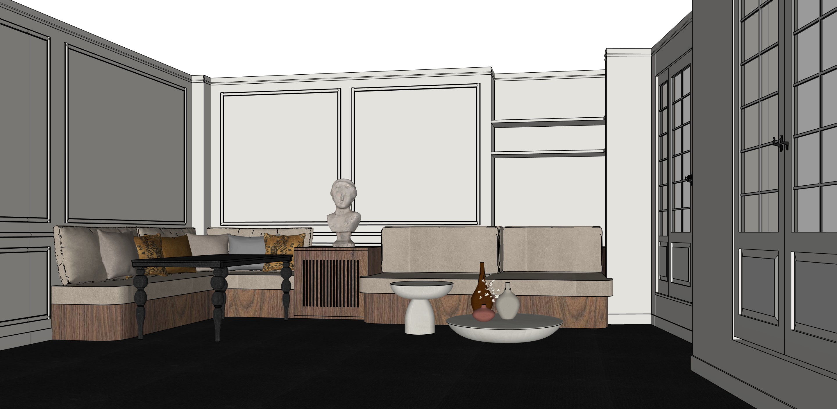 the walls are in light greige with subtle mouldings it is a parisian apartment on the 6th floor of a parisian building add ancient books on the shelves
